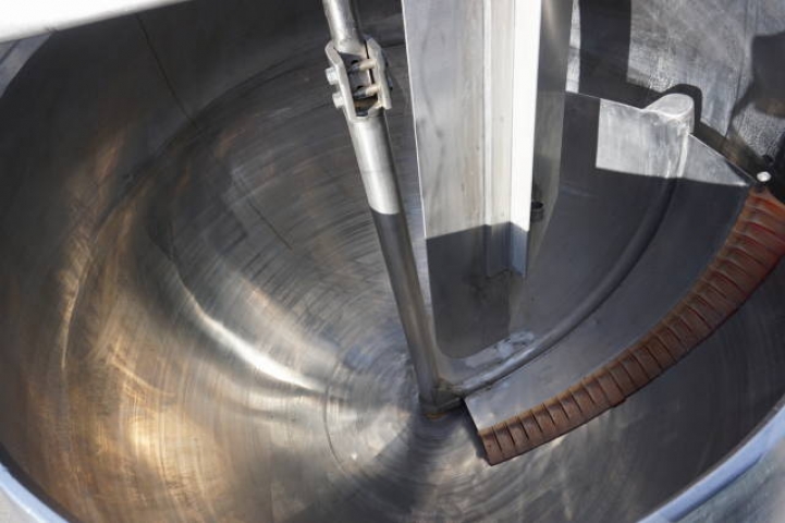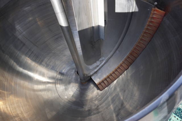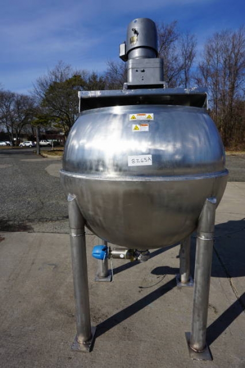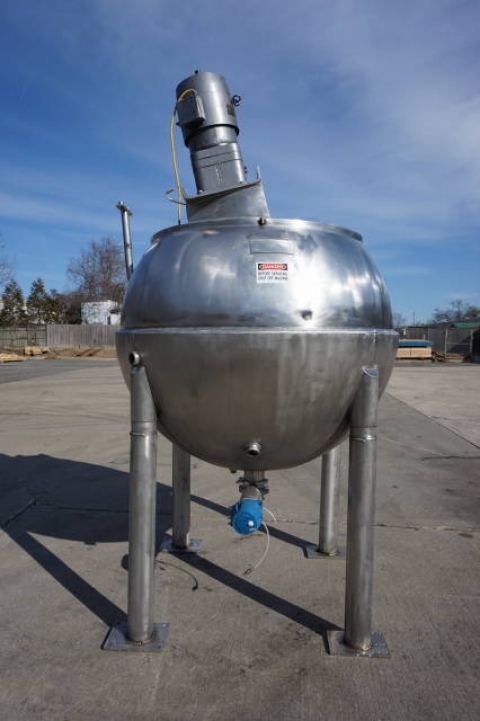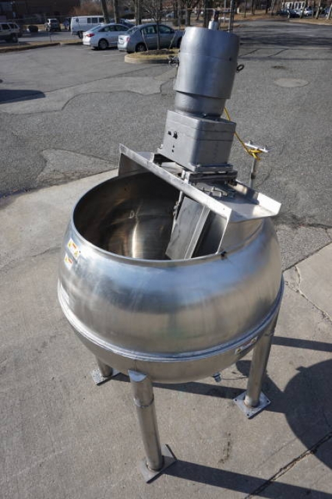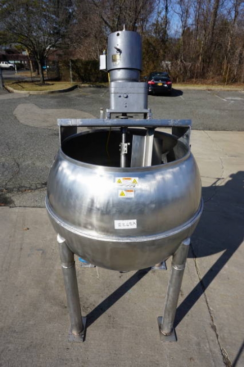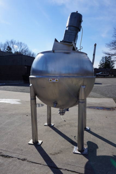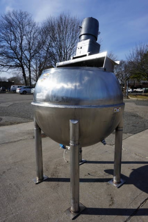 1-Used Groen 300 Gallon Stainless Steel Spherical Inclined Agitated Jacketed Kettle, Model INA-300SP. Jacket rated 100 PSI at 338 Deg. F, National Board #56657, Code Stamped. Equipped with inclined scraper agitator, kettle has stationary baffle and was last used in the food industry. Equipped with 4 inch diameter Tri-Clamp bottom discharge outlet with pneumatic discharge valve and top mounted 3HP 3/60/220-440 volt motor. The INA Model is designed particularly for handling medium to heavy viscous products. Ideally suited for fruit pie fillings, stews, chowders and other heavier products. (Stock #8265A)