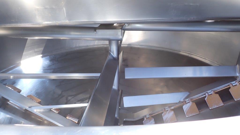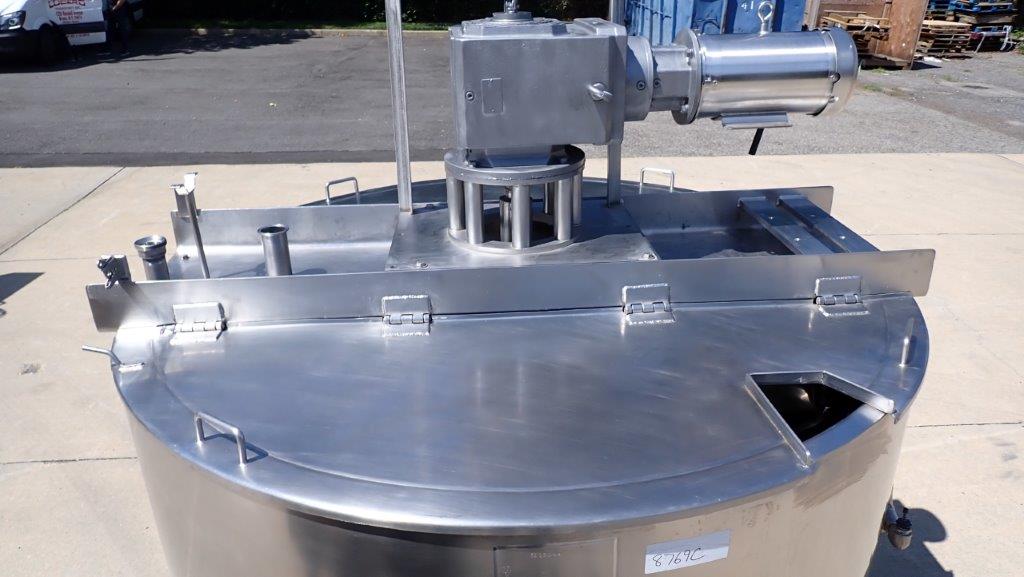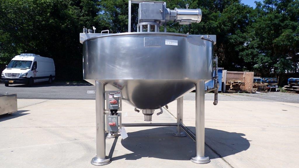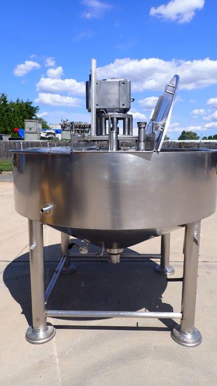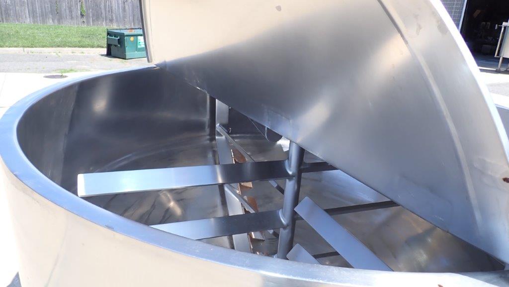 1 – Used Lee 300 Gallon Type 316 Stainless Steel Jacketed Scraper Agitated Cooker/Cooler, Model 300U9MS, S/N 70498-1-2. Last used in food production, this cooker/cooler has stainless steel legs and top-mounted Washdown drive motor. With side scraping agitator, with cross paddles, machine is jacketed for 100 PSI @ 338 Deg. F, the National Board number is 12332, and code stamped. Equipped with a hinged lid, the vessel has approximately 4 In. diameter bottom outlet. (Stock # 8769C)