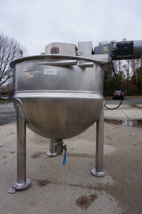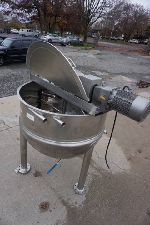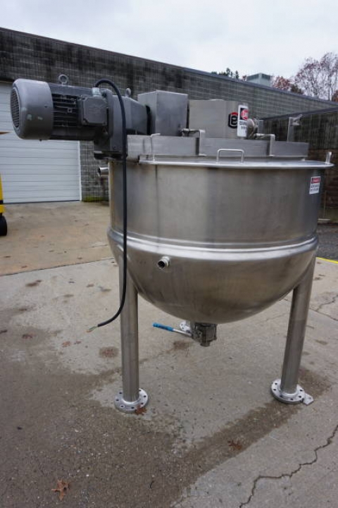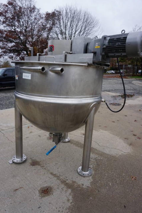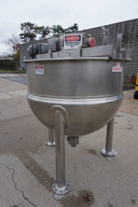 1-Used Lee 300 Gallon Stainless Steel Jacketed Double Motion Mixing Kettle, Model 300D9MS, S/N 68273-1-1. Dimensions approx. 54 In. Diameter X 42 In. Deep, kettle is jacketed for 40PSI at 287 Deg. F., National Board #12213, code stamped. Double motion scraper agitator driven by top-mounted Nord 7.5HP, 3/60/230-460 Volt motor. On approx. 40 In. high stainless steel legs, kettle has stainless steel two piece lid and approx. 3 In. diameter center bottom “tri-clamp” outlet. (Stock #8248A)