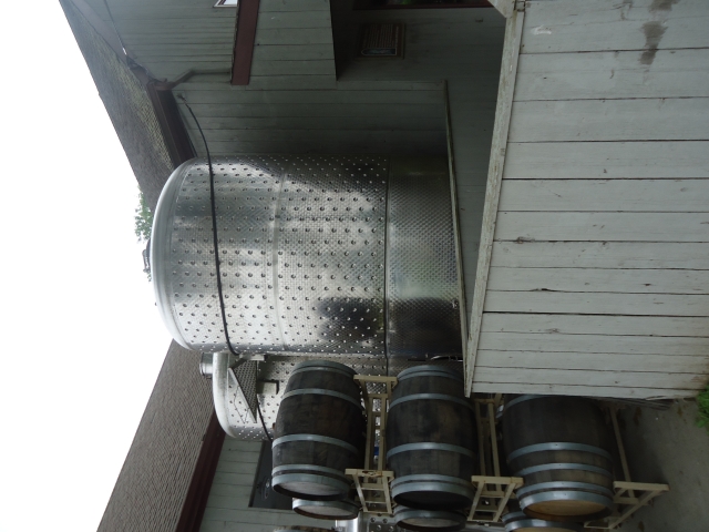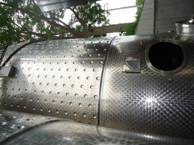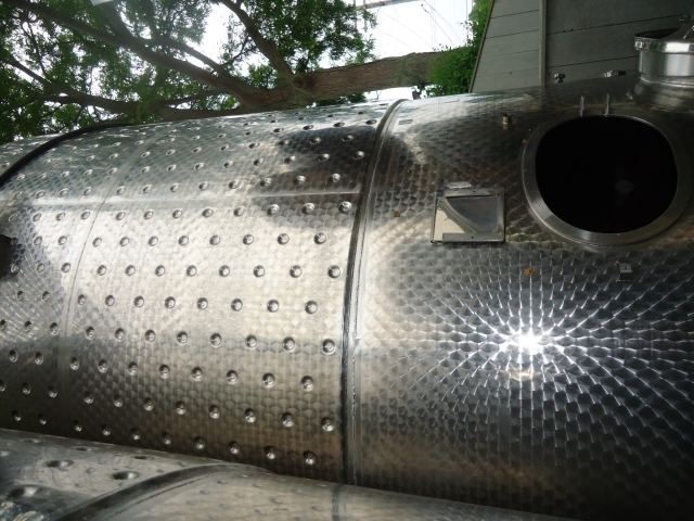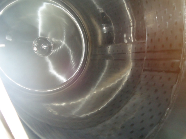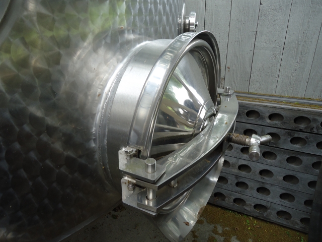 1-Used approx. 3,000 Gallon Stainless Steel Dimpled Jacketed Closed Vertical Tank.  Dimensions approx. 84 in. diameter X 120 in. on straight side.  With dished top head and sloped bottom head.  With approx. 2 in. diameter tri-clamp side bottom discharge and 18 in. side manway.  On approx. 33 in. high legs, used on red wine production.  (Stock # L1291)