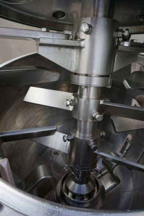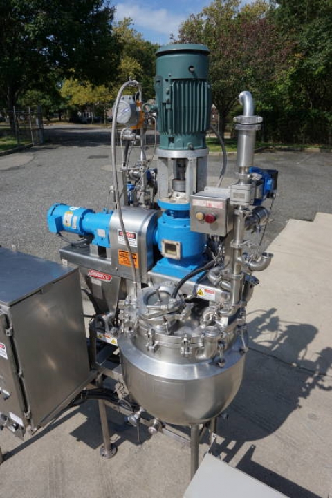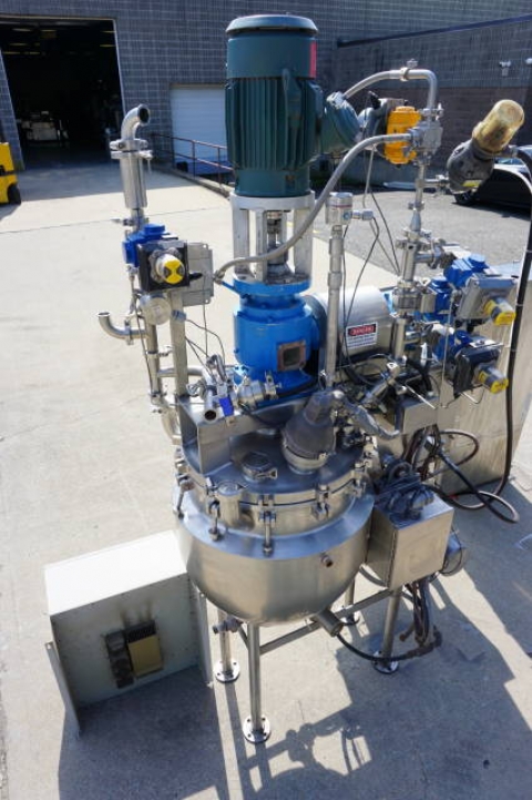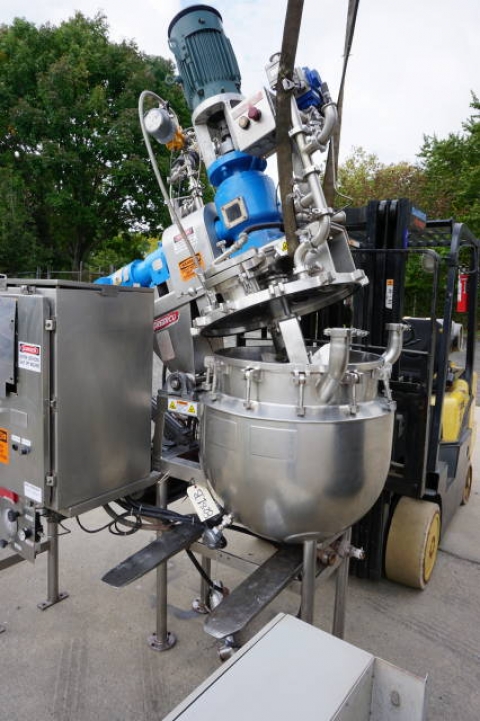 1- Gifford Wood Approx. 33 Gallon (125 liters) Working Capacity Stainless Steel “Agi-Mix” Jacketed Vacuum & Pressure Kettle/Reactor Vessel, Model 125L/V&P/AGI, S/N 92-390-3397. Vessel jacketed for 40 psi @ 287 deg. F. Rated internally 20 psi @ 338 deg. F and/or full vacuum, National Board # 2444, code stamped. Kettle has a center bottom discharge outlet with flush type plug valve. Equipped with double motion agitation driven by 1.5 HP 3/60/208-230/460 volt motor. High speed homogenizing head has top driven by 5 HP 3 phase, 60 cycle, 230-460V explosion proof motor. Equipped with motorized hydraulic unit and cylinder for automatic tilt out of agitator assembly. Vessel on stainless steel legs. Top lid has approx. 6 in. diameter inlet with hinged cover, off center light instrument, and miscellaneous tri-clamp fittings, and bottom entering thermowell. Includes stainless steel electrical control cabinet, VFD, and operator station (missing HMI). (Stock #8281B)