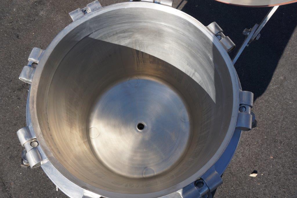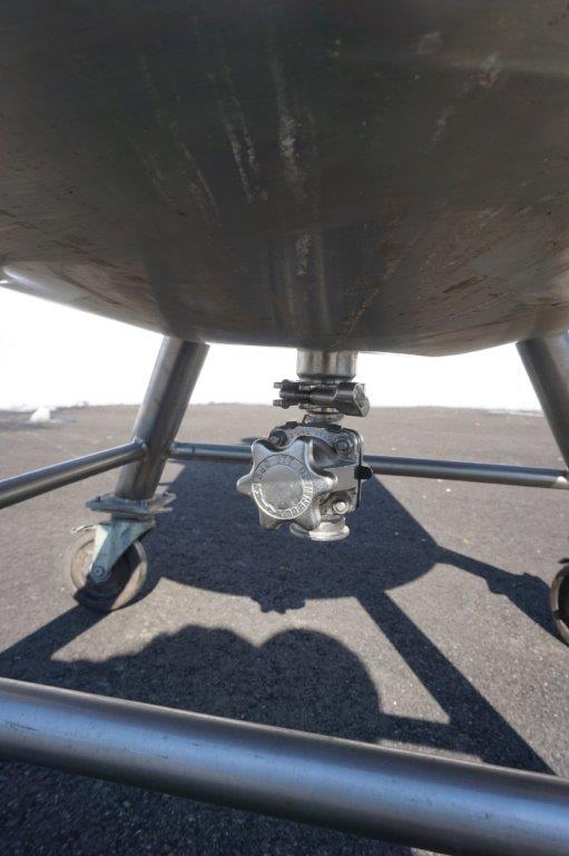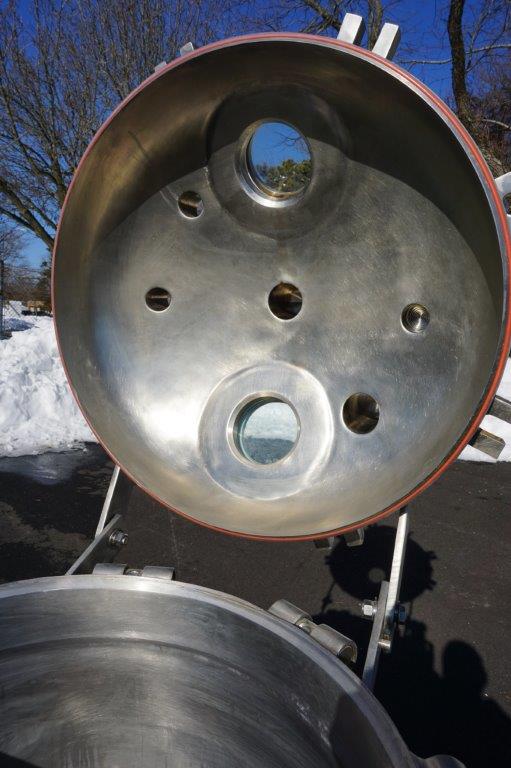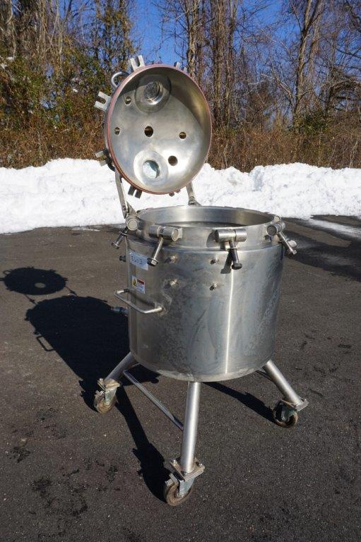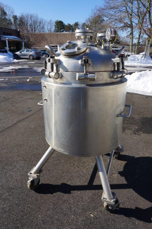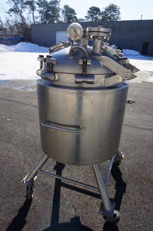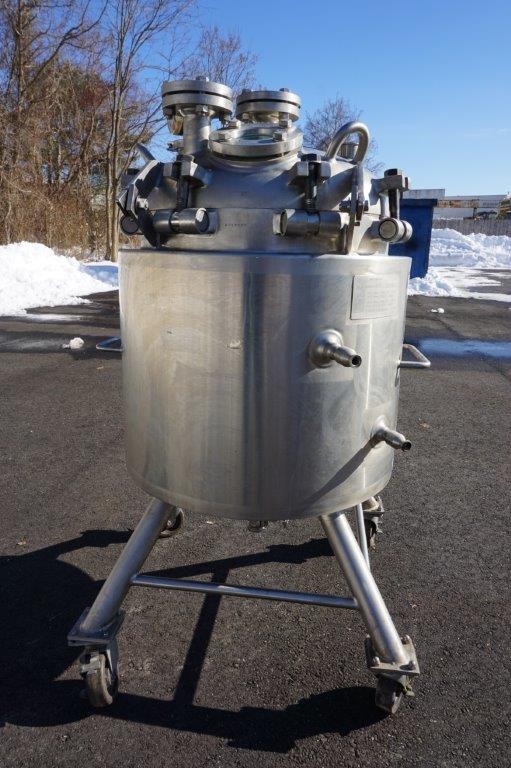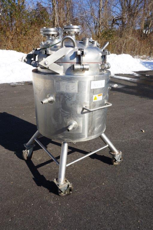 1-Used APV Crepaco Approx. 35 Gallon Stainless Steel Jacketed Pressurized Tank/Reactor, S/N G6325. Interior dimensions approx. 22 In. Diameter X 24 In. on straight side, vessel has cone bottom head and bolted dished top head. Vessel is jacketed for 85 PSI at 300 Deg. F. and 50 PSI at 300 Deg. F. internally, National Board #8134, Code stamped. Mounted on portable stainless stand with casters, bottom has approx. 1-1/2 In. diameter center bottom outlet with valve. Top head has 7 assorted inlets, including site glass. (Stock #8603)