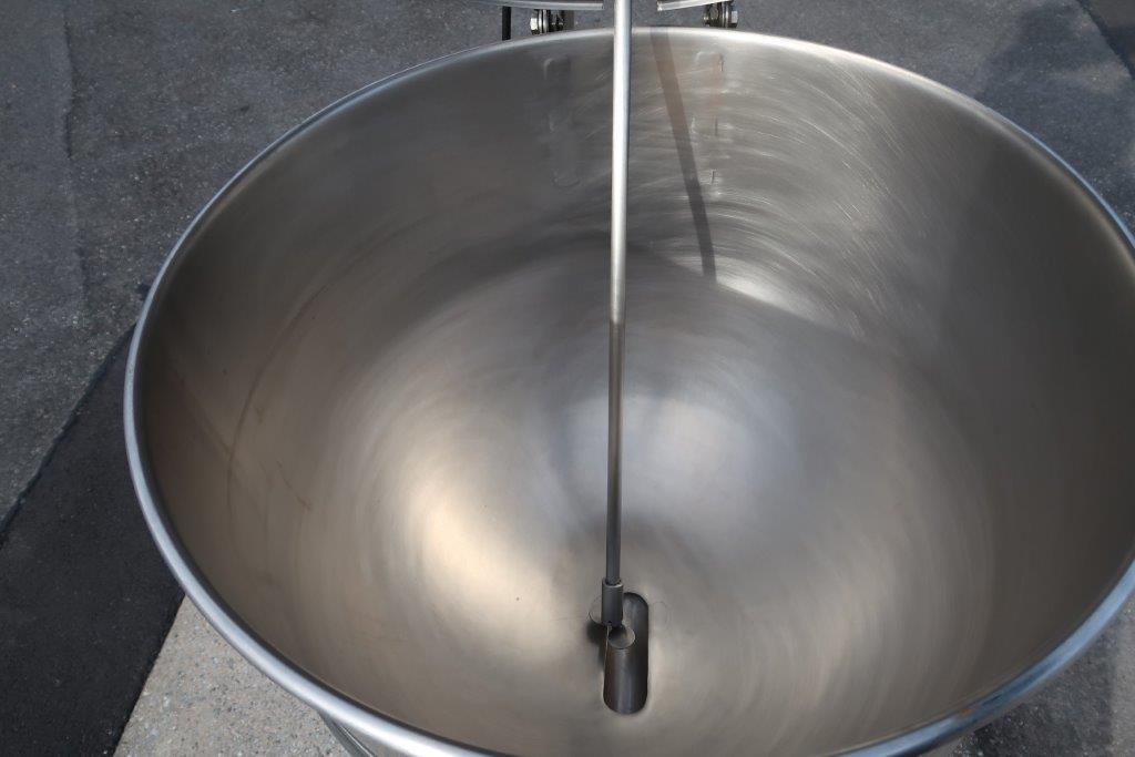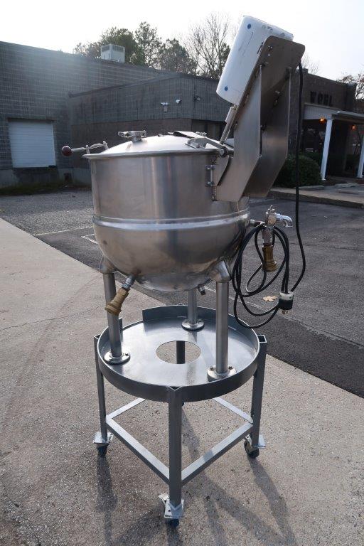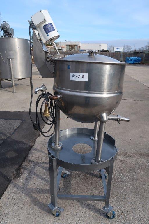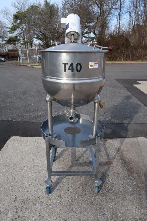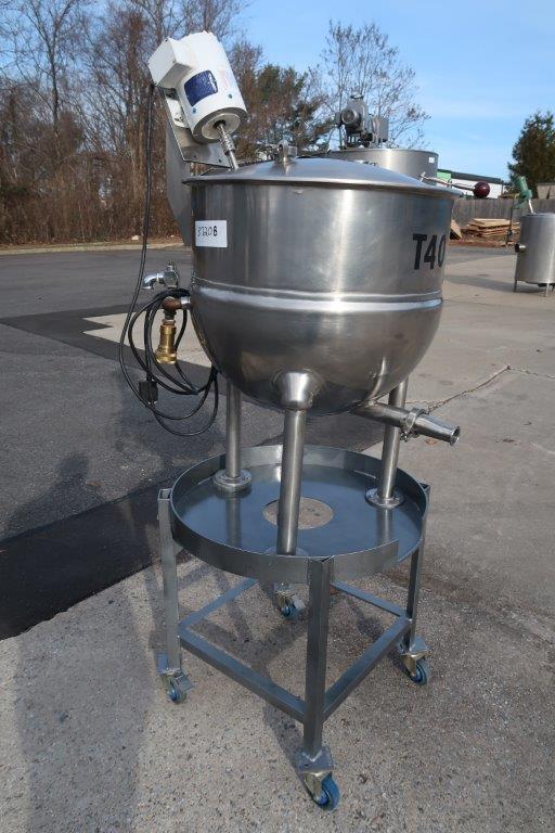1-Used Groen 40 Gallon Stainless Steel Jacketed Portable Mix Kettle, Model FT40, Serial number 102973. Dimensions approximately 26 In. diameter X 22 In. deep. Jacket rated 25 PSI @ 300 Deg. F., National Board and Code Stamped. Equipped with 1/2 HP Single phase, 60 cycle, 110 Volt top mounted motor for driving the stainless steel shaft with prop. With hinged lid, kettle has bottom discharge with 1-1/2 In. Tri-Clamp fitting. Mounted on portable stand with casters. (Stock # 8720B)