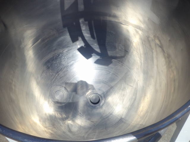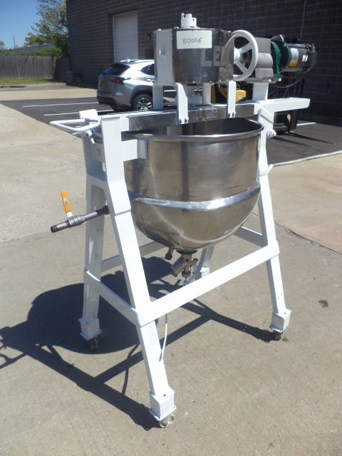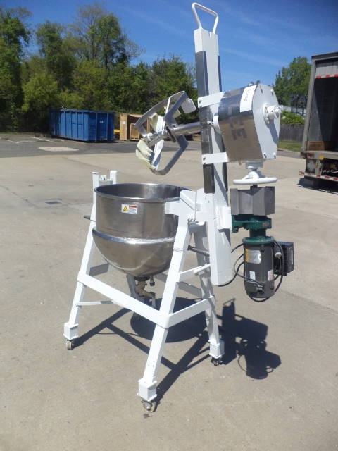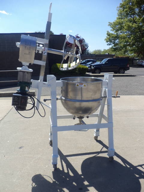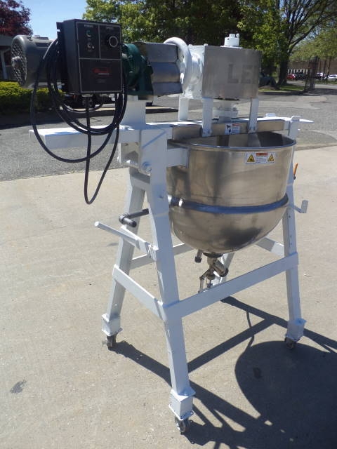 1-Used Lee 40 Gallon Stainless Steel Jacketed Double Motion Mix Kettle, S/N 607K. Tank dimensions approx. 26 in. diameter x 23 in. deep. Jacket rated 90PSI @ 650 Deg. F, code stamped. With double motion agitation driven by 3/4 HP DC motor and Minarik variable speed control. Mounted on A-frame portable stand with casters, kettle has approx. 2 in. diameter center bottom outlet with valve. With internal thermowell (no instrument included). Agitator assembly capable of tilt out for cleaning. (Stock #8003E)