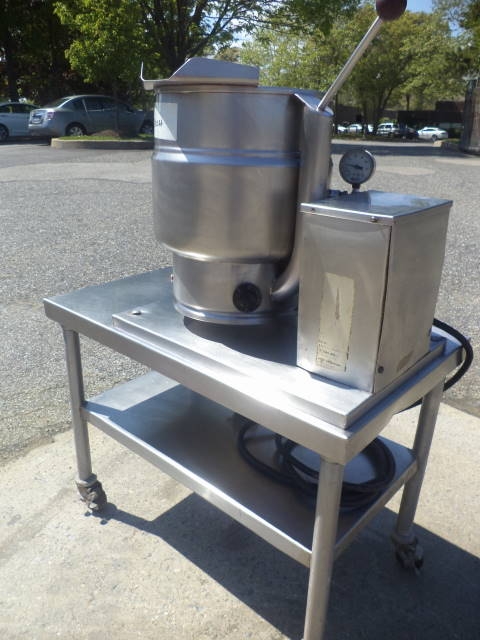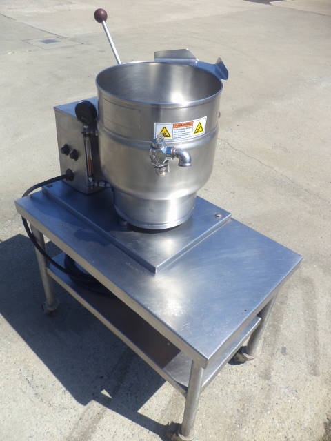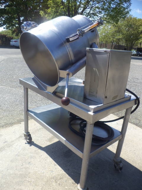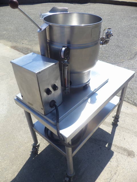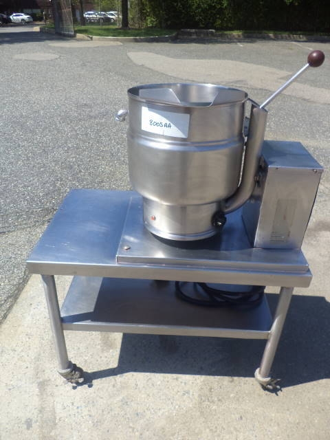 1-Used Groen 5 gallon Stainless Steel Self-Contained Electric Kettle, Model TDB/7-20. Dimensions approx. 14 in. diameter x 12 in. deep. Kettle is jacketed for 50 PSI @ 300 Deg. F., National Board # 79303, Code stamped. Electric specifications single phase, 60 cycle, 208 volt. With tilt discharge, kettle is mounted on portable stainless steel table with casters. (Stock #8005AA)