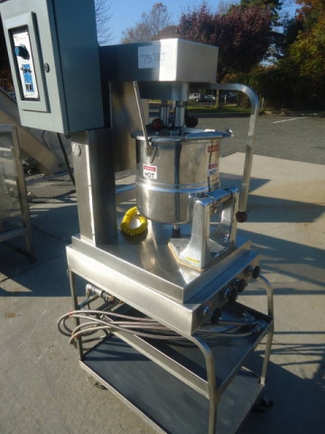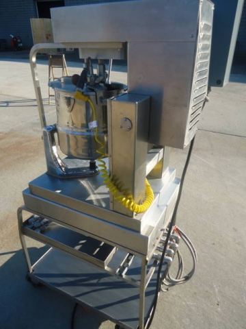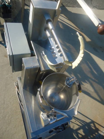 1-USED GROEN APPROX. 5 GALLON 316 STAINLESS STEEL JACKETED TWIN ACTION MIXING KETTLE, MODEL TDC/2/TA-20SP.  JACKET RATED 100 PSI @ 338 DEGREES F, NATIONAL BOARD # 68637, CODE STAMPED.  KETTLE BODY DIMENSIONS APPROX. 12 IN. DIAMETER X 12 IN. DEEP.  AGITATION CONSISTS OF SIDE SCRAPER AGITATOR AND OFF CENTER COUNTER CURRENT BAR TYPE AGITATOR DRIVEN BY SPEED-A-MATIC VARIABLE SPEED CONTROLLER.  WITH STAINLESS STEEL LIDS, KETTLE MOUNTED ON PORTABLE CART.  (STOCK # 7528J)