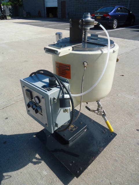 1-Used Kemwall approx. 5 Gallon Stainless Steel Contact Parts Jacketed Self-Contained Electric Mix Kettle, S/N VMHS-3546. Mounted on portable stand with casters, Kettle is equipped with pitched bladed agitator driven by top mounted air motor. With hinged lid, control panel has temperature control and variable speed control for agitation. (Stock 8031D)