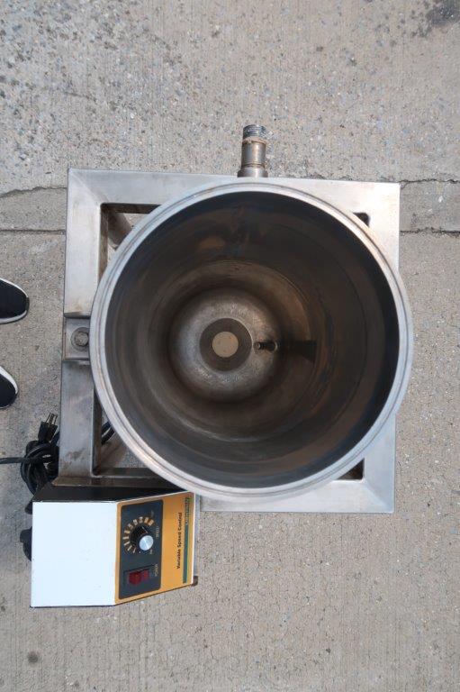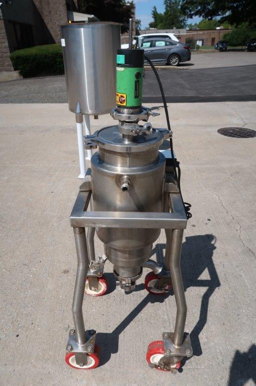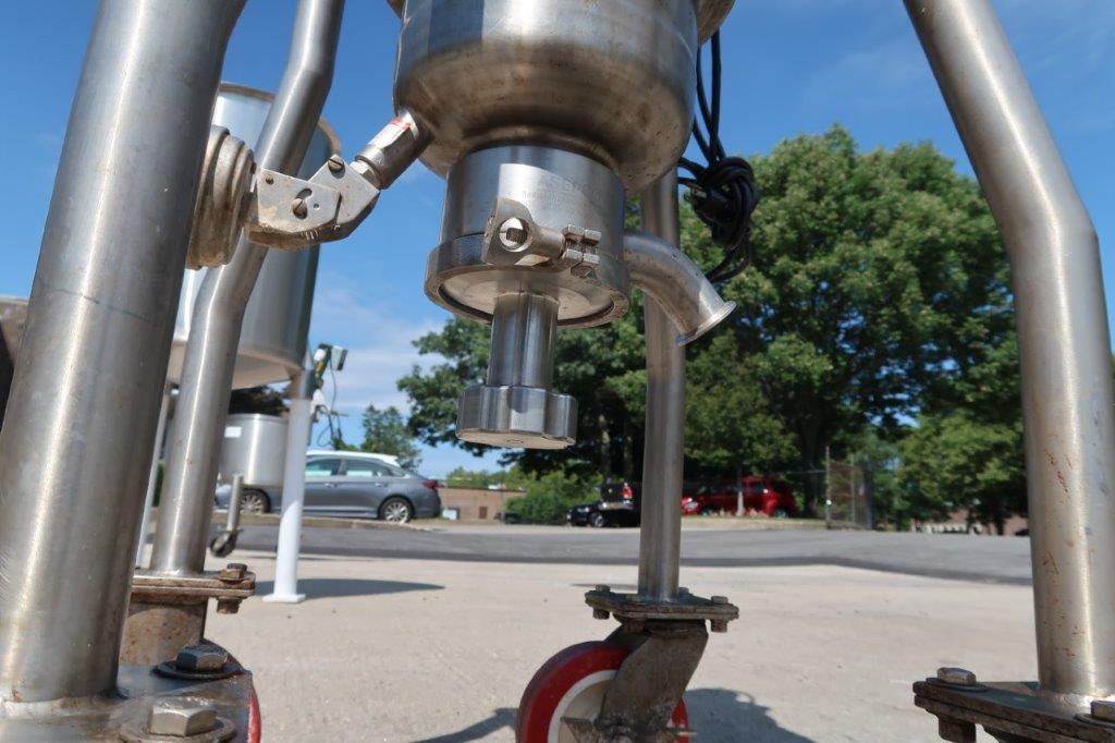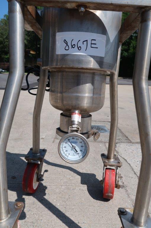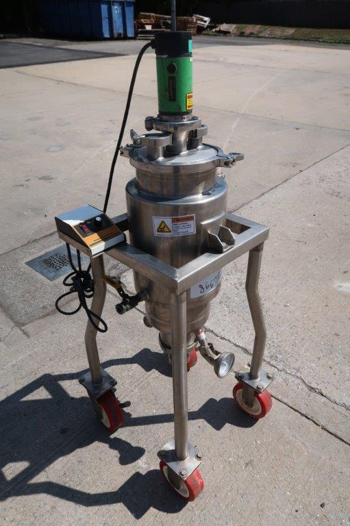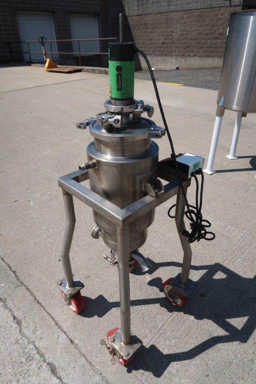 1 – Used approx. 5 Gallon Stainless Steel Jacketed Mix Tank. Interior dimensions approx. 8 In. diameter X 20 In. deep, tank is mounted on portable stainless steel stand with casters. Equipped with Lightnin’ Fractional HP single phase electric mixer with variable speed control, tank has approx. 1-1/2 In. diameter center bottom outlet. Equipped with top lid with two(2) tri-clamp inlets, tank last used in the pharmaceutical industry (Stock # 8667E)