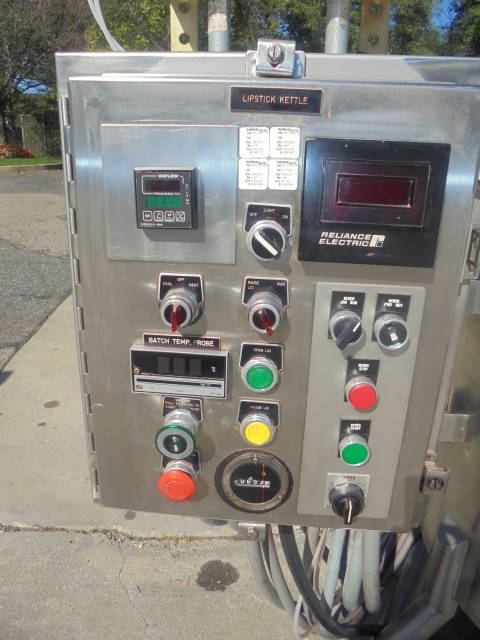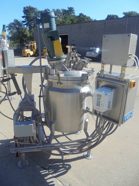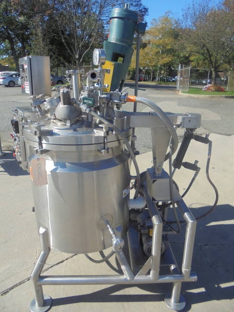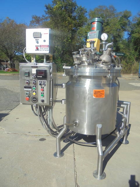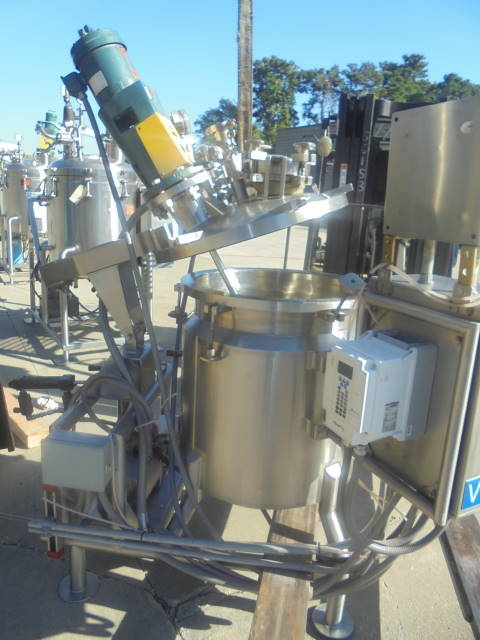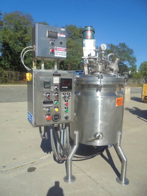 1-Used Cherry Burrell Approx. 50 Gallon Type 316 Stainless Steel Jacketed Pressurized Mix Kettle/Reactor, S/N 85E-254-1. Interior dimensions approx. 24 In. Diameter x 29 In. deep, plus dished bolted top head. Rated maximum working pressure internal 15PSI at 320 Deg. F., maximum external working pressure 15PSI @320 Deg. F., and jacket 75PSI at 320 Deg. F., National Board #2606, code stamped. Equipped with propeller agitation, driven by Lightnin XJC .30HP 3/50-60/208-220/440 Volt agitator drive. With hydraulic cylinder and Delta Power self-contained hydraulic motor for automatic tilt-out of agitator assembly. With stainless control panel with agitator speed control, there is a separate panel for digital temperature readout display. Top head has assorted inlets including light instrument, vessel has Power Flex 70 variable frequency drive and bottom center approx. 1-1/2 in. diameter discharge outlet with valve. (Stock #8142C)