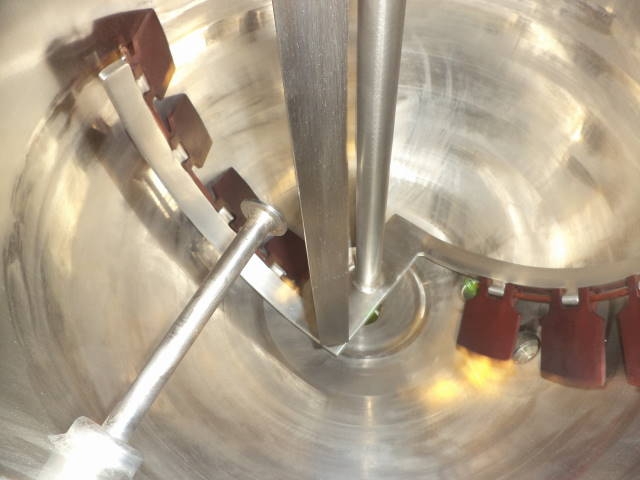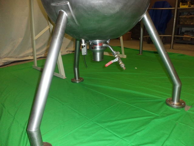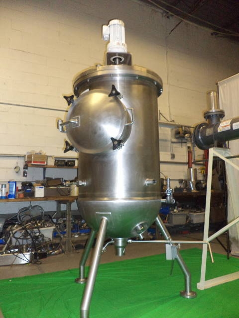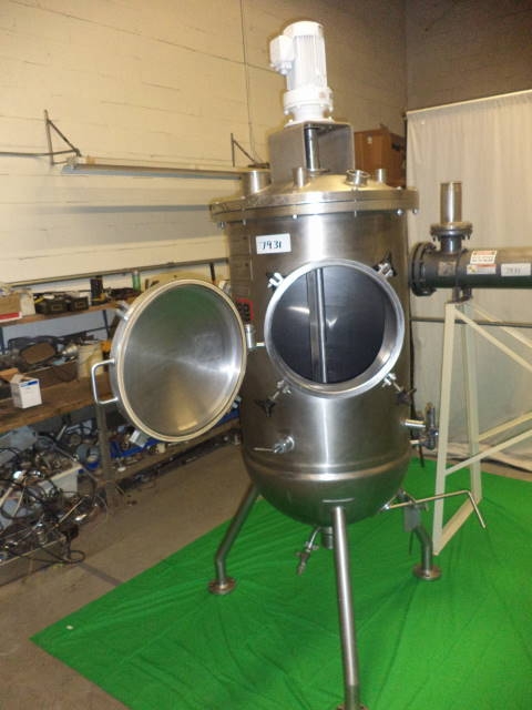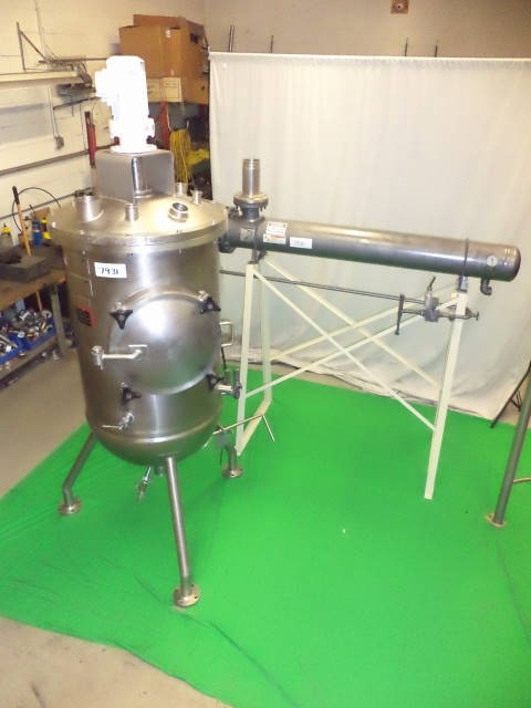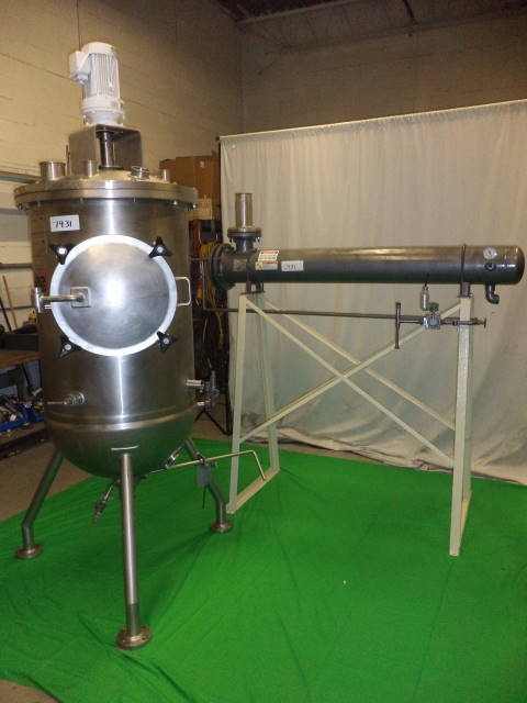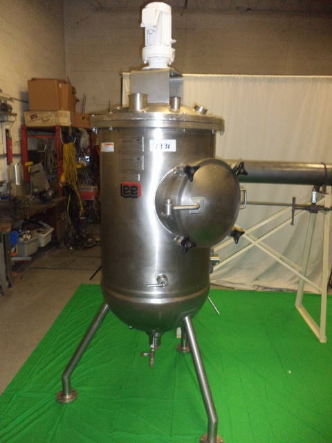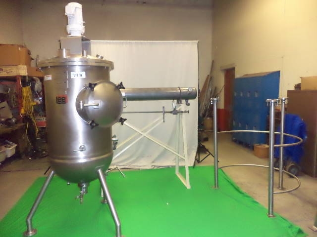 1-Used Lee 50 Gallon Type 316 Stainless Steel Jacketed Agitated Vacuum Pan/Kettle/Reactor, Model 50 D7SVP, S/N  C-1231-A.  Vessel jacketed for 90 PSI @ 332 Degrees F. and for 15 PSI and full vacuum at 250 Degrees F.,  Code Stamped.  Last used in blueberry processing, vessel equipped with scrape surface agitation with top mounted 1.5 HP 3/60/230-460 volt gear motor.  With assorted tri-clamp fittings, vessel on stainless steel legs and has approx. 3 inch diameter center bottom outlet with valve.  With 18 inch diameter side manway with hinged lid.  Equipped with horizontal shell and tube heat exchanger/condensor rated 150PSI at 375 Degrees F., shell and tube side.  (Stock # 7931)