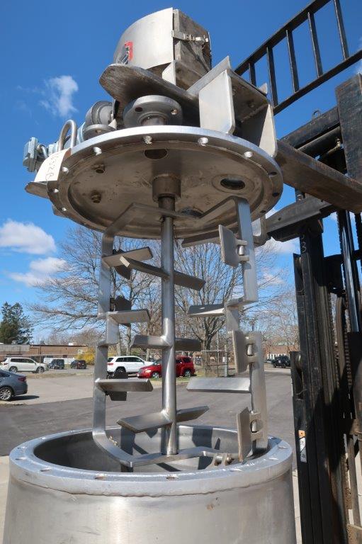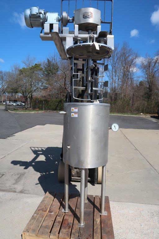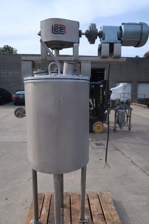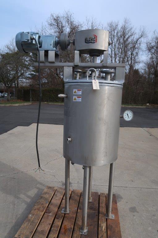 1 – Used Lee 50 Gallon Stainless Steel Double Motion Jacketed Vacuum Reactor, Model 50 U9MS, S/N A-5610. Interior dimensions approximately 24 In. diameter X 34 In. deep. Shell material is Type 316 Stainless. Vessel rated 150 PSI jacket @ 400 deg. F, and internally rated 15 PSI and full vacuum, National board number 2392, code stamped. Double motion scraped surface agitator driven by 3 HP 3/60/230-460 volt explosion proof motor. On 33 In. high stainless steel legs, reactor has dished bottom with center bottom outlet with approx. 3 In. diameter Lee “Fluid Flow” valve. With top bolted head with 5 assorted top openings, including sight glass. (Stock # 8632B)