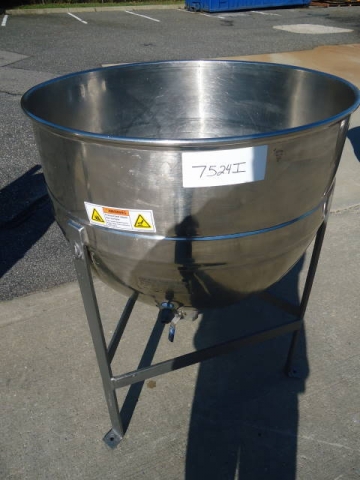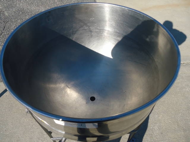 1-USED LEE 50 GALLON STAINLESS STEEL JACKETED HEMISPHERICAL KETTLE, S/N 165L. DIMENSIONS APPROX. 30 IN. DIAMETER X 23 IN. DEEP. KETTLE IS JACKETED FOR 40 PSI @ 290 DEGREES F. EQUIPPED WITH APPROX. 1-1/2 IN. DIAMETER CENTER BOTTOM OUTLET WITH VALVE. ON LEGS. (STOCK # 7524i)