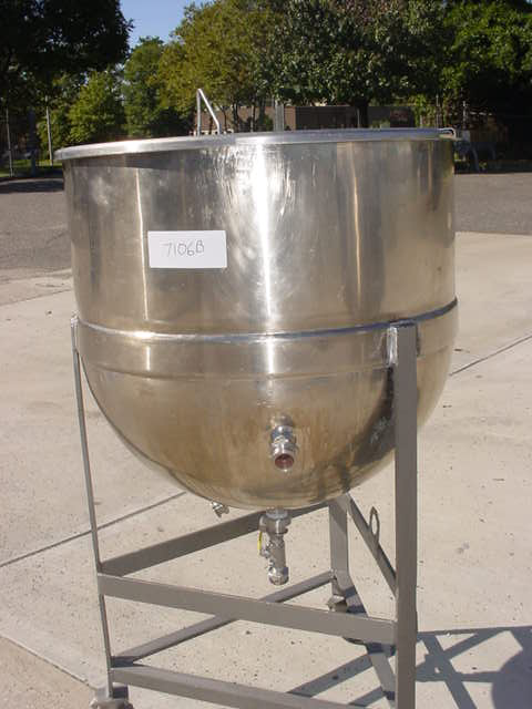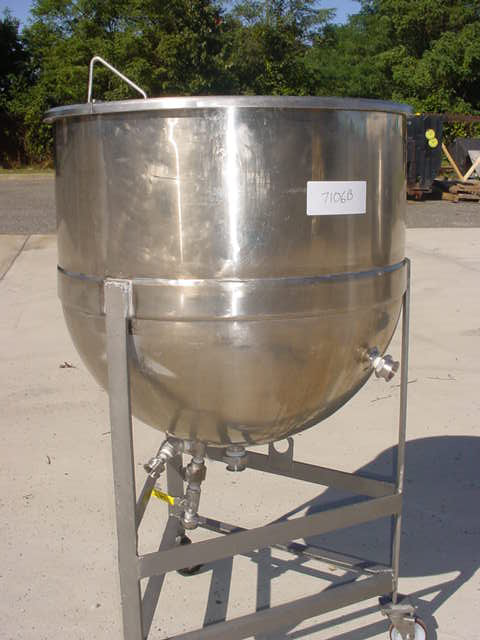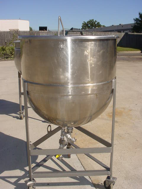 1-Used approx. 50 gallon stainless steel jacketed hemispherical portable kettle. Dimensions approx. 32″ diameter x 30″ deep. With center bottom discharge, approx. 1-1/2″ diameter with valve. With stainless hinged lid, kettle is on legs with casters.