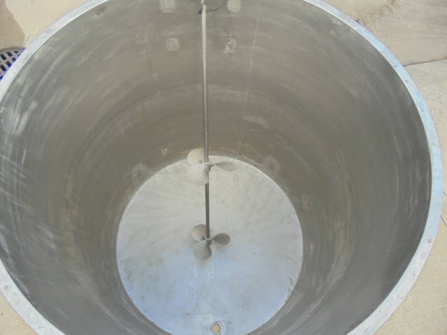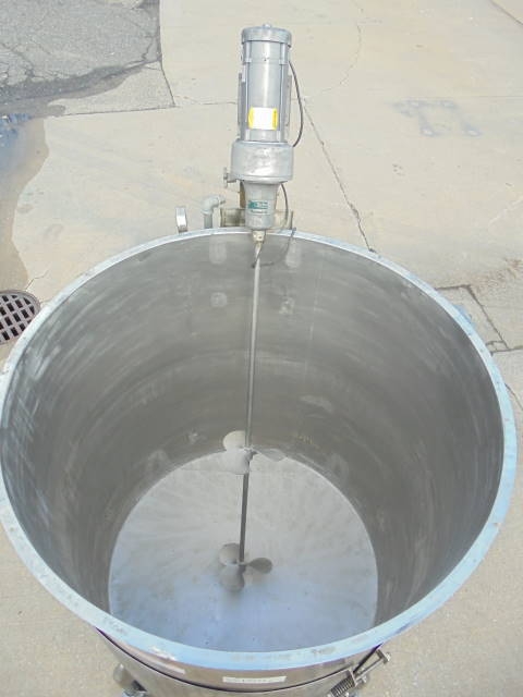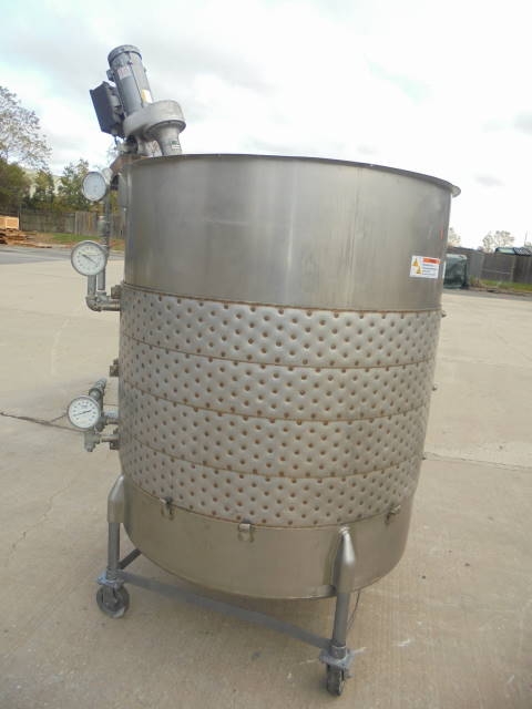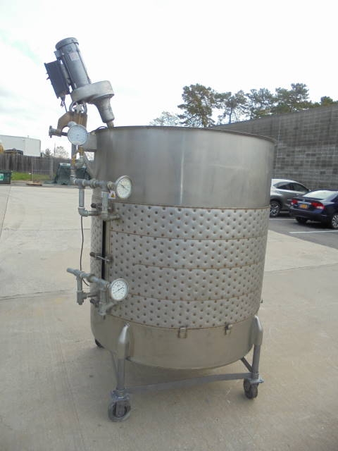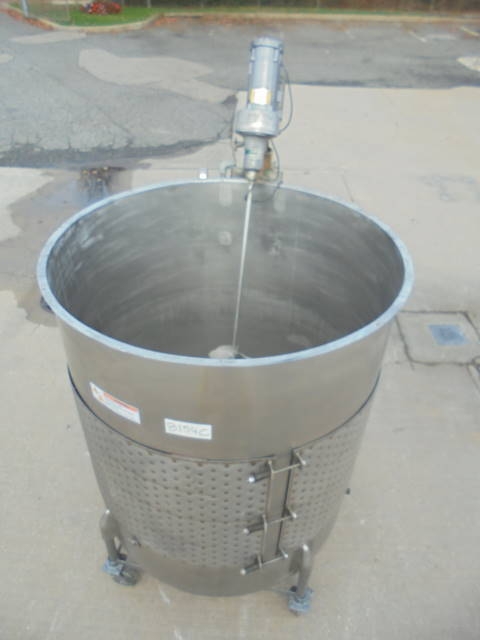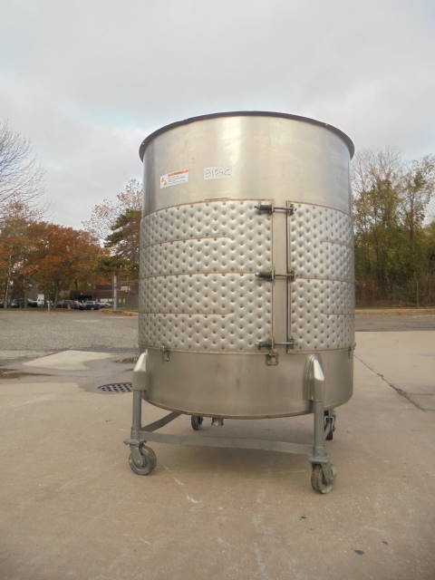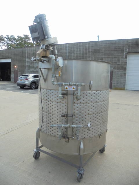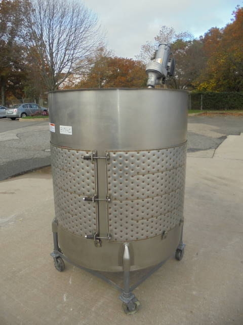 1-Used Viatec/Chem-Tek Approx. 500 Gallon Type 316 Stainless Steel Vertical Mix Tank. Dimensions approx. 52 in. diameter X 59 in. deep, tank has two 30 in. high removable dimple jacketed panels installed. With sloped bottom, tank is on casters for portability and equipped with approx. 2 in. diameter tri-clamp bottom discharge outlet. Can be supplied with “Mix-Mor” clamp-on agitator with stainless propellers and variable speed control at additional cost. (Stock #8154C)