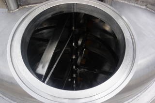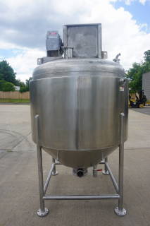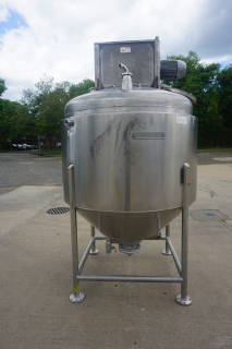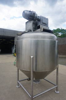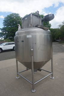1-Used Casale Industries Approximately 500 Gallon Stainless Steel Jacketed Scraper Agitated Mix Kettle/Reactor.  Interior diameter approximately 56 In. X 40 In. deep on straight side, plus cone bottom.  With dished top head, vessel has scraped surface agitation with cross paddles and flight, and is driven by 5HP 3/60/230-460 Volt TEFC motor.  With offset 14 In. diameter top manway, kettle is on legs and equipped with both 3 In. diameter bottom outlet with hand operated valve and 4 inch diameter bottom outlet with air operated valve. (Stock #8376)