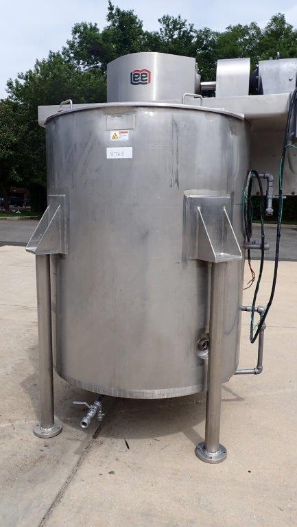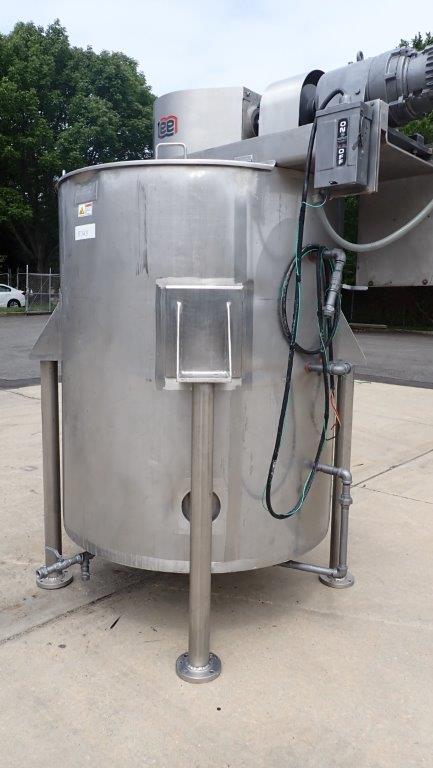 1- Used Lee 500 Gallon Stainless Steel Jacketed Double Motion Scraper Agitated Mix Kettle/Tank, Model 500U9MS, Serial Number B5546A1. Interior dimensions approximately 54 inch diameter by 60 inch deep. Jacket rated 100 PSI @ 338 Deg. F., National Board number 4893, Code Stamped. Equipped with top mounted 5 HP, 3/60/230-460 Volt motor, kettle has approximately 4 inch diameter bottom discharge with valve. With stainless steel hinged lid (Stock #8763)