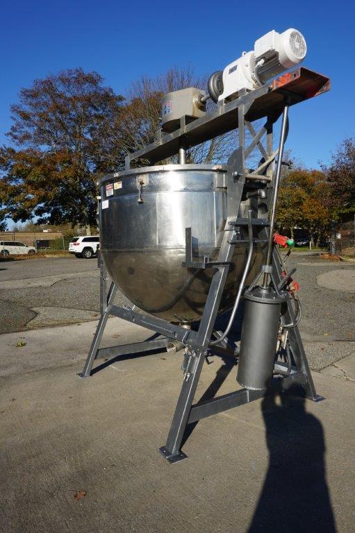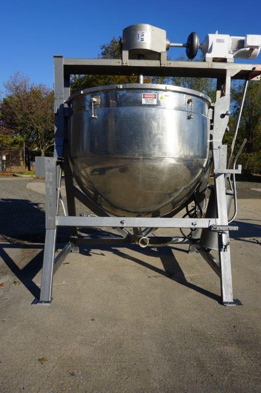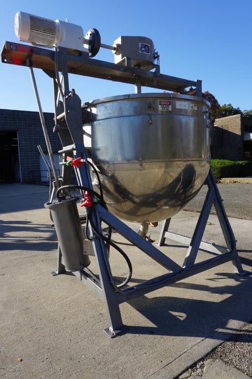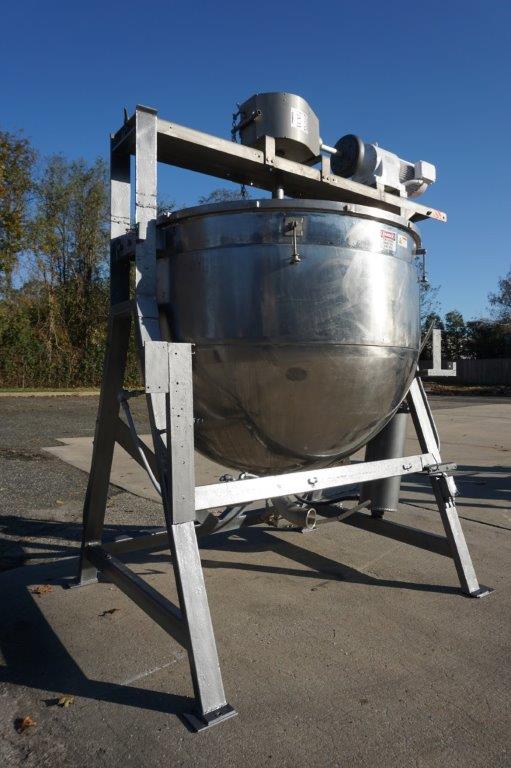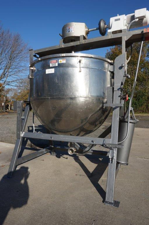 1-Used Lee 500 Gallon Stainless Steel Jacketed Double Motion Scrape Surface Agitated Kettle Model 500DV9MT.  Mounted in “A” Frame Assembly, Kettle is rated 90 PSI in  jacket @ 350 Degrees F, National Board # 1671, Code Stamped.  Kettle interior dimensions approx. 62 in. diameter X 50 in. deep.  Equipped with double motion scrape surface agitation.  Driven by top mounted Eurodrive 7.5 HP 3/60/208 volt.  Equipped with bottom 4 in. diameter flush bottom outlet with valve.  Kettle in self-contained cylinder for “tilt out” of entire agitator assembly.  Last used in personal care products.  (Stock #8438)
