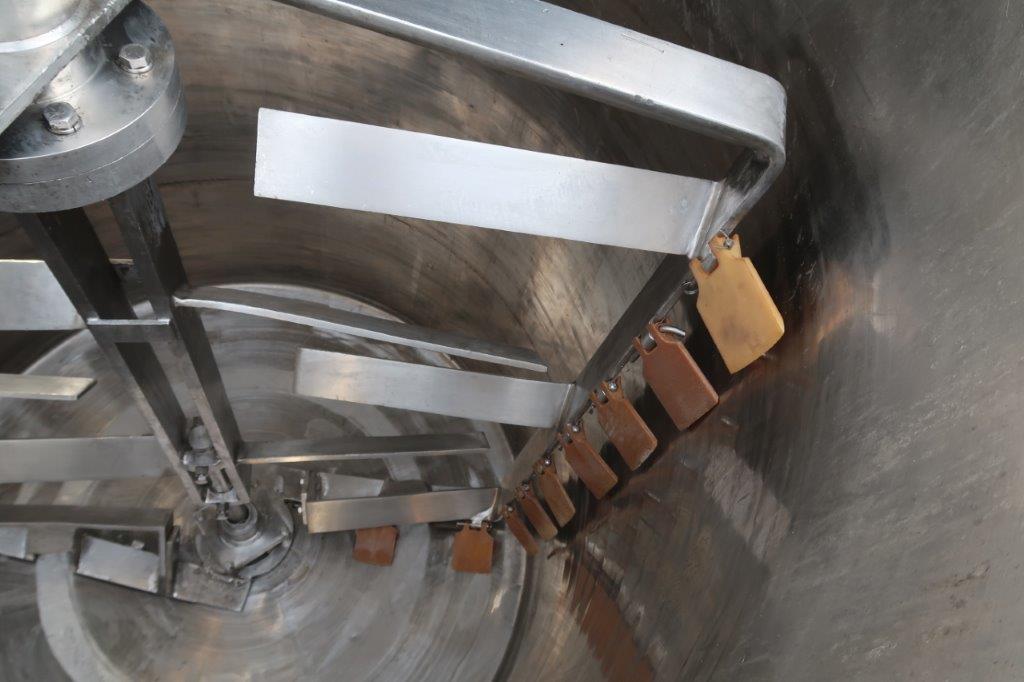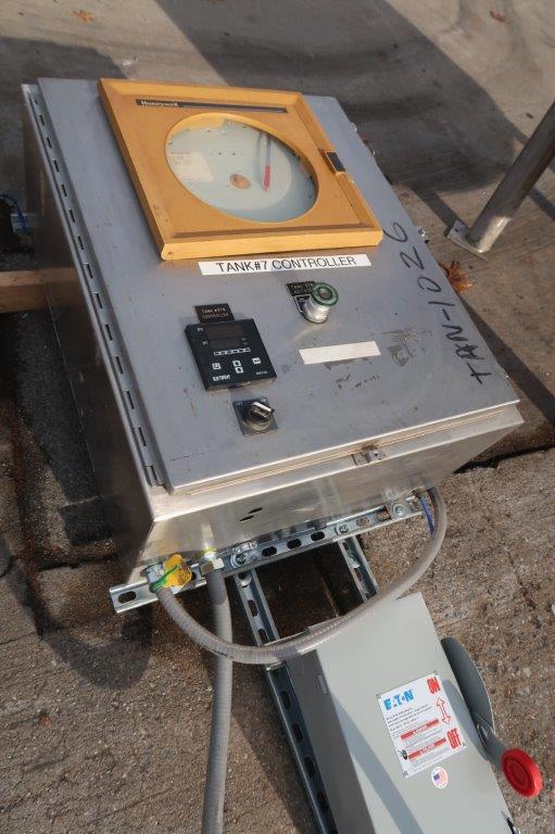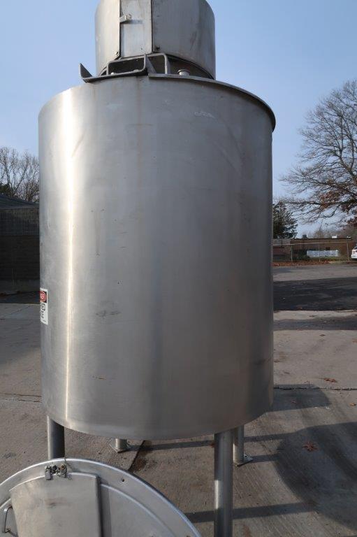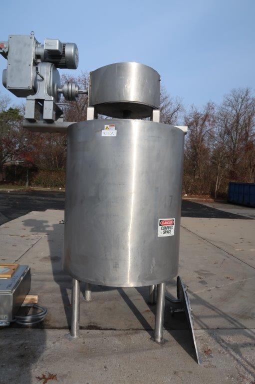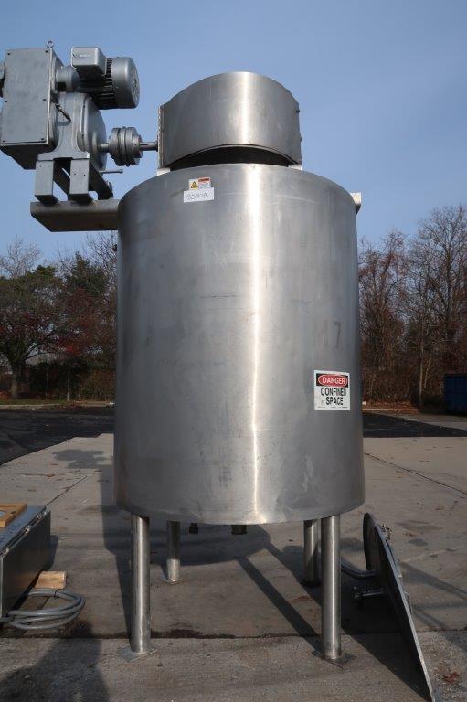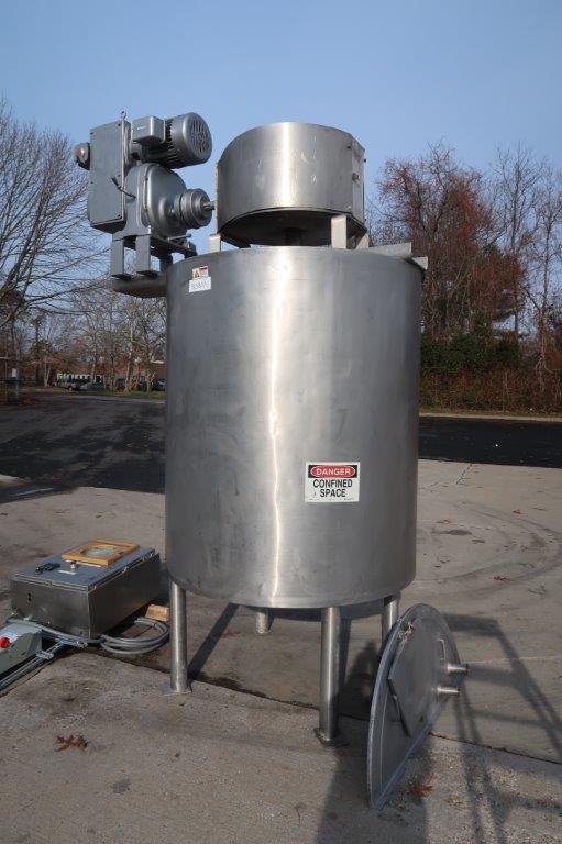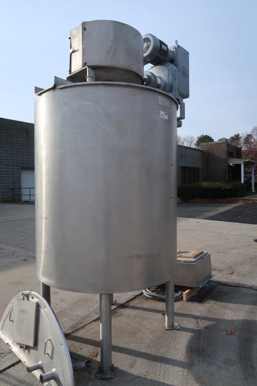 1-Used Lee 500 Gallon Type 316 Stainless Steel Jacketed Double Motion Mix Kettle/Tank, Serial Number A-4714-B. Interior dimensions approx. 48 In. Diameter X 60 In. on straight side, plus dished bottom. Equipped with double motion scrape surface agitation, driven by 7.5HP, 3/60/230-460 Volt motor with Sterling gearbox with variable speed control. Kettle is jacketed for 100 PSI @ 350 Deg. F., National Board #2058, code stamped. Equipped with stainless steel control panel with Extech variable speed controller, as well as a Honeywell chart recorder, kettle has 25 In. High stainless steel legs. Equipped with stainless sectional top lid with approx. 15 In. X 13 In. hatch with hinged lid. Vessel is equipped with approx. 3 In. diameter center bottom outlet with Lee “Fluid-Flow” valve with tri-clamp fitting. With assorted top inlets, kettle was last used in the personal care products industry. (Stock #8580A)