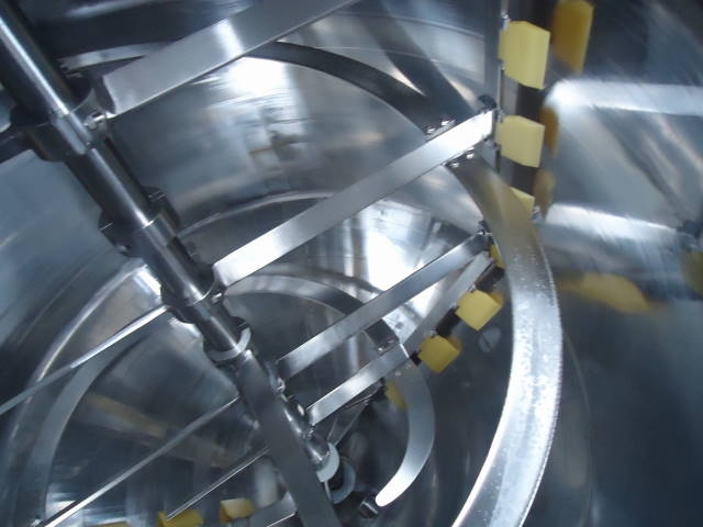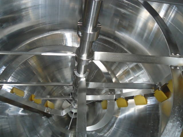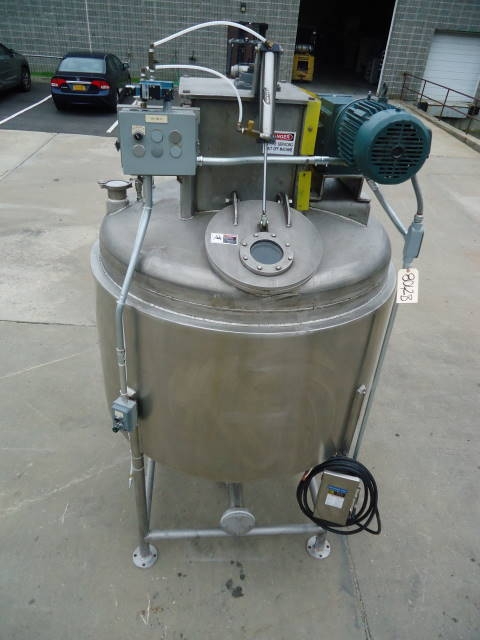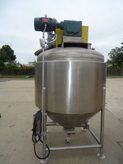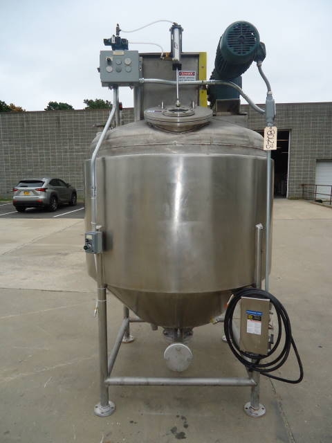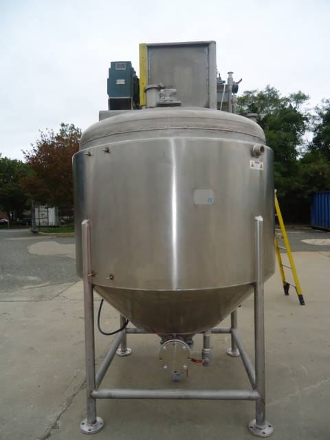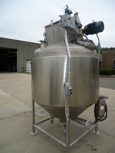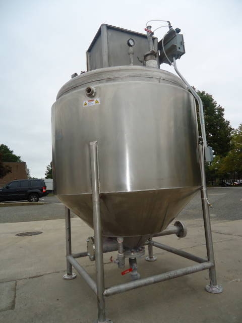 1-Used Casale Industries approximately 500 Gallon Stainless Steel Jacketed Vacuum Scraper Agitated Mix Kettle/Reactor. Interior diameter approx. 56 inch by 40 inch deep on straight side, plus cone bottom. Last used in the production of toothpaste, vessel jacketed for 100 PSI @300 degrees F and rated 30 PSI and vacuum internally. Manufactured in 2014, reactor has dished top and cone bottom with center bottom outlet with valve, terminating in approx. 2 inch diameter 90 deg. elbow, and dual tangential discharges as well. Scraper agitation with cross paddles and flight is driven by 5 HP 3/60/230-460 volt TEFC motor. Equipped with offset top manway 14 in. dia, with lid with sight glass and pneumatic cylinder for automatic opening of lid. Vessel is CE (Certified European) rated. (Stock #8042B)
