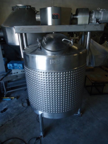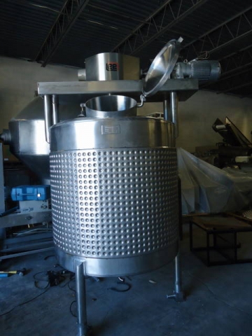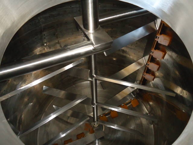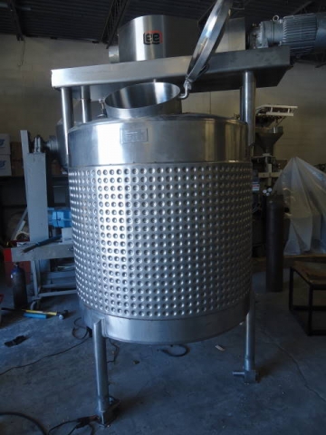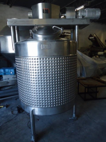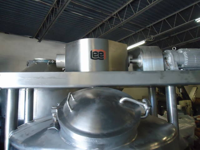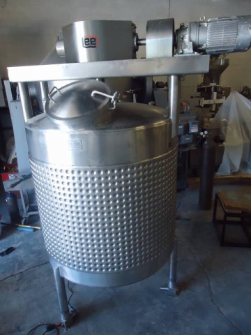 1-Used lee 550 gallon type 316 stainless steel double motion dimple jacketed mixing kettle/tank, s/n b5832a. Dimensions approx. 56 inches diameter x 57 inches on the straight side plus dished top and bottom heads. With double motion scraper agitator driven by 10 hp 3/60/230-460 volt motor. Dished top head has approx. 19 inch diameter manway with hinged lid, as well as four (4) additional smaller top inlets. On stainless steel tubular legs, vessel has lee “fluid flow” discharge valve with tri-clamp discharge. (stock #7495b)