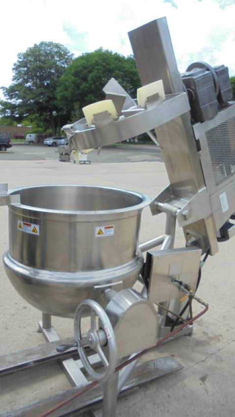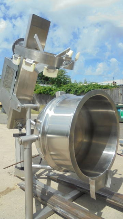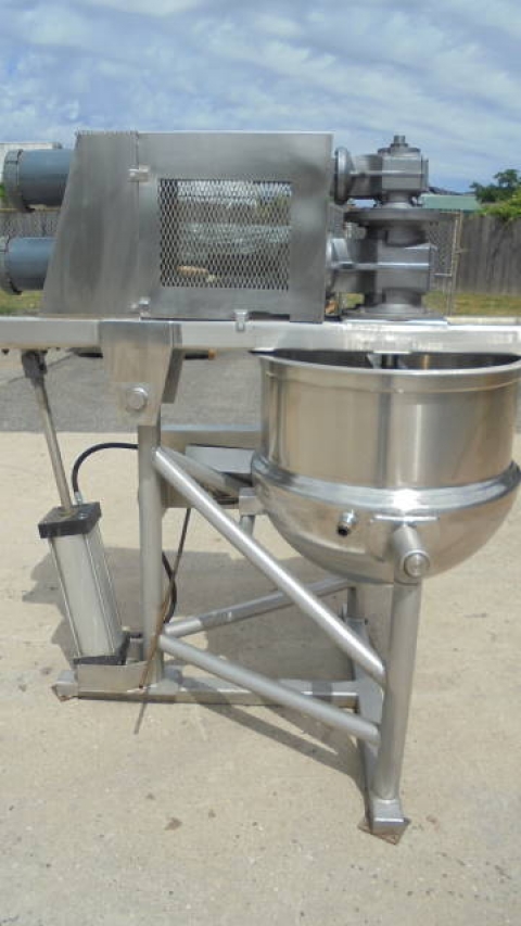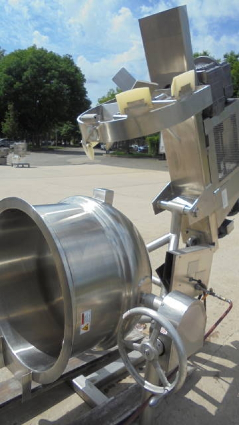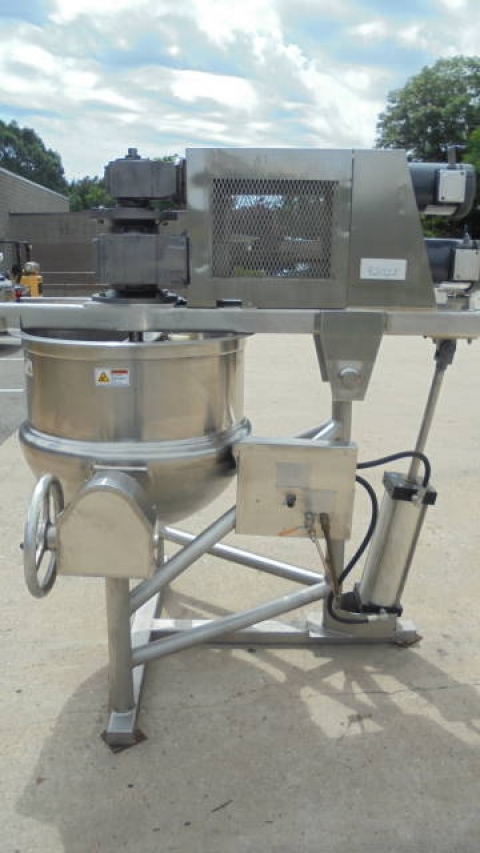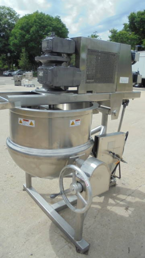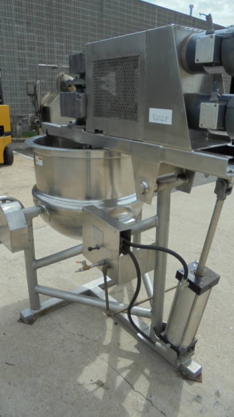 1-Used Befco approx. 60 Gallon Stainless Steel Jacketed Double Motion Mix Kettle, S/N B07-1129. Dimensions approx. 30 in. diameter X 28 in. deep, Kettle is jacketed for 90 PSI @300 degrees F, National Board #142, Code stamped. Equipped with double motion scraper agitator driven by 3 HP and 1.5 HP motors, both 3/60/230-460 volt. With handwheel for tilt discharge, Kettle has self-contained pneumatic cylinder for automatic tilt out of agitator assembly. Mounted on stainless base, Kettle has two-piece stainless lid. Last used in food production. (Stock # 8202E)