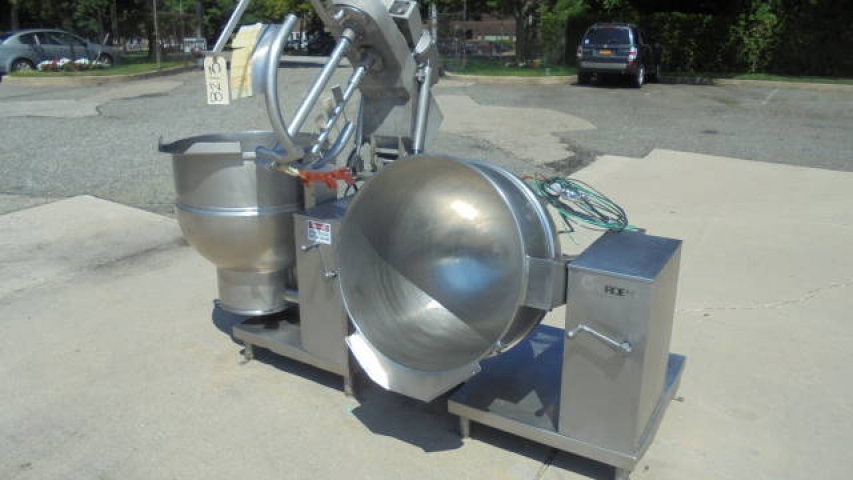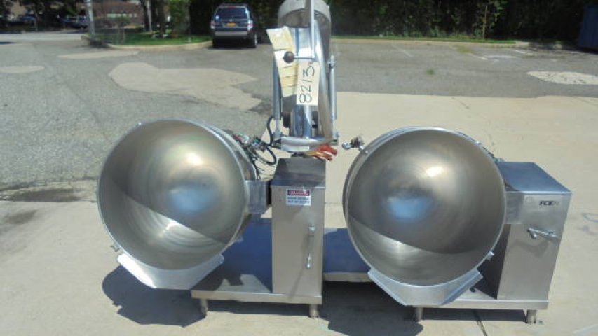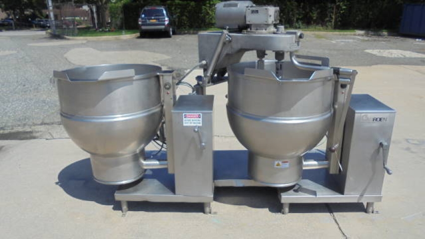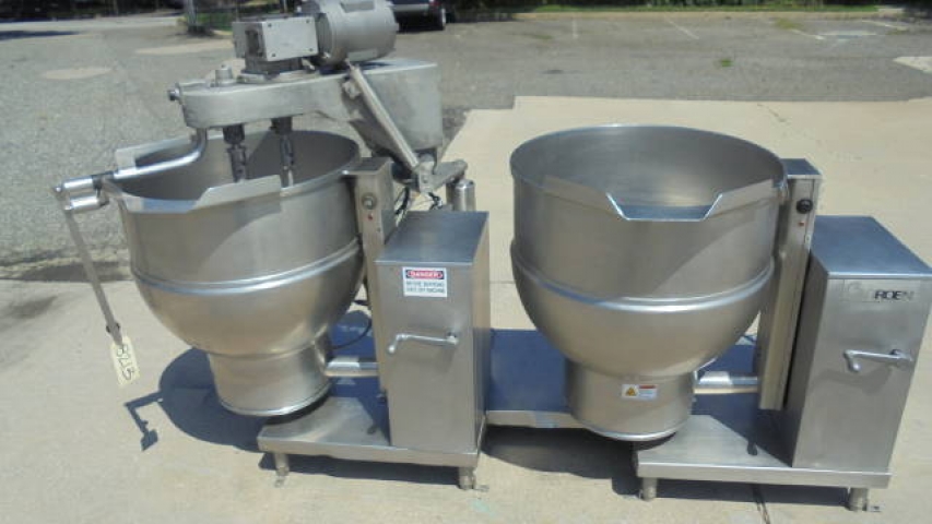 1-Used “battery” of two (2) Groen 60 Gallon Stainless Steel Self-Contained Tilt Kettles. Each Kettle has Model DEE/4-60, Serial Numbers 23074 & 23106 respectively. Kettles are jacketed for 50 PSI @ 300 Degrees F, National Board and Code Stamped. Each Kettle meaures approx. 30 in. diameter X 24 in. deep. Equipped with “pivoting” twin action scrape surface agitation which enables mixing in one Kettle and then “pivoting” action allowing mixing for the second Kettle. With tilt discharge on both Kettles, twin action agitator driven by 2HP/1HP 3 phase, 200 volt motor. Mounted on stainless steel base, Kettles last used in food industry. (Stock # 8213)