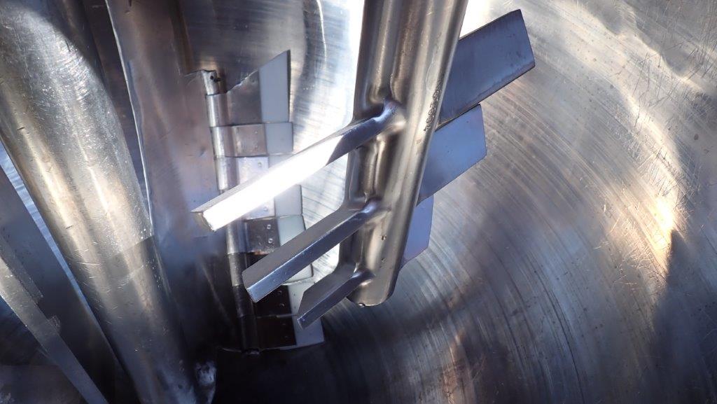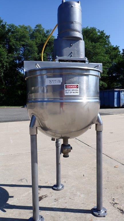 1- Used Groen 60 Gallon Stainless Steel Jacketed Twin Action Scraper Agitated Kettle, Model TA60SP, Serial Number 39153. Dimensions approximately 32 In. diameter X 26 In. deep. Jacket rated 100 PSI, agitation consists of scraper agitator, counter-current “bar style” agitator and stationary baffle. Driven by 2 HP, 3/60/220-440 Volt motor/reducer, kettle has bottom discharge outlet with hand operated valve (Stock #8771B)