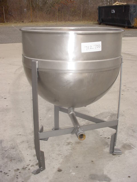 1-Used lee 60 gallon stainless steel kettle, s/n 217p. Dimensions approx. 32″ diameter x 24″ deep. Kettle is jacketed for 90 psi @ 330 degrees f, code stamped. On legs, kettle has approx. 1-1/2″ diameter center bottom outlet.
