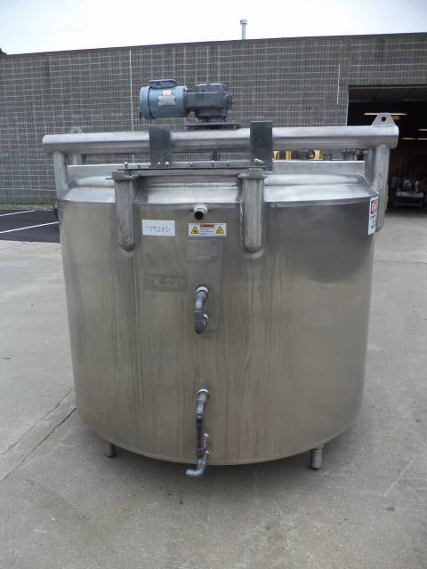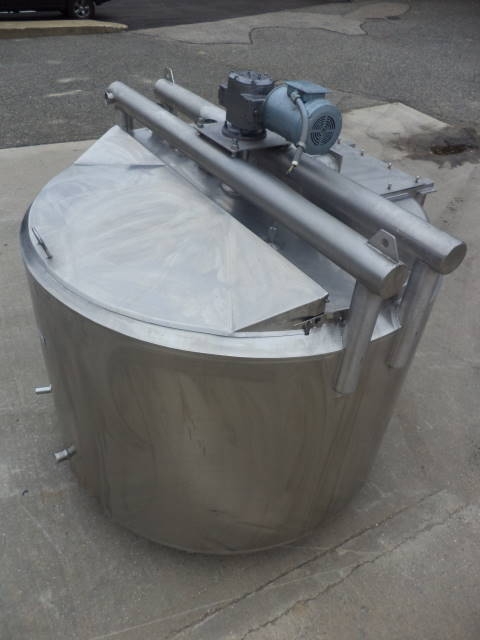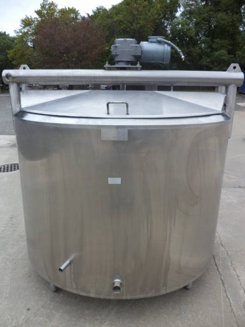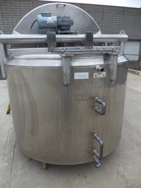 1-Used Cherry Burrell approx. 600 Gallon Stainless Steel Jacketed Process Vessel, S/N E-175-90. Interior dimensions approx. 66 in . diameter X 43 in. deep. Jacket rated 100 PSI @ 350 degrees F, National Board #3451, Code Stamped. Equipped with sweep agitator, top driven by 1/2 HP 3/60/208-230-460 volt motor. Half of lid section is hinged and the other half of lid section is bolted/welded. With sloped bottom with approx. 2 in . diameter Tri-Clamp discharge. Top head has assorted top openings and there is twin head CIP sprayball. (Stock #7928D)