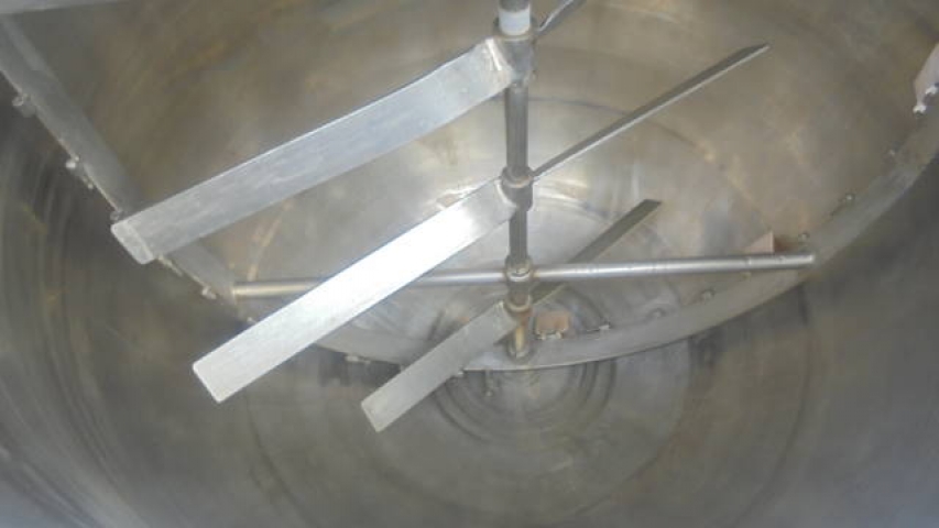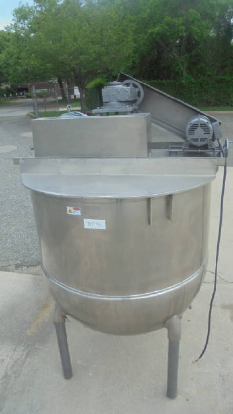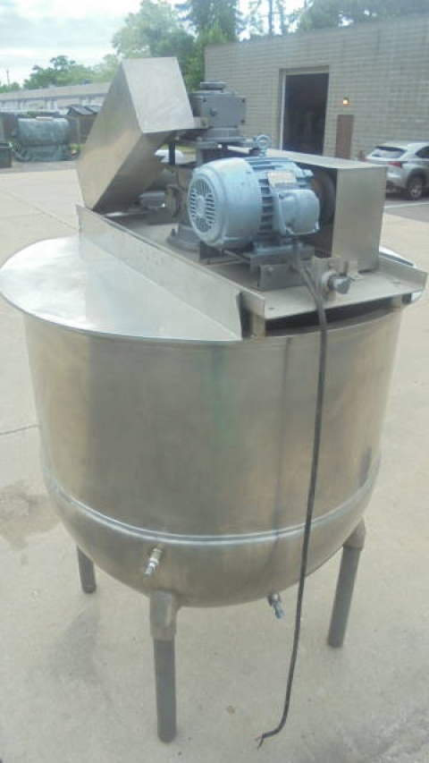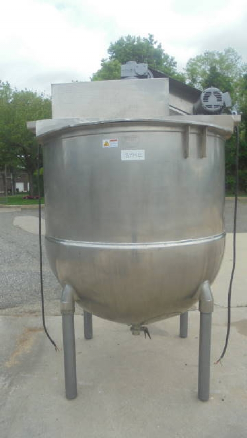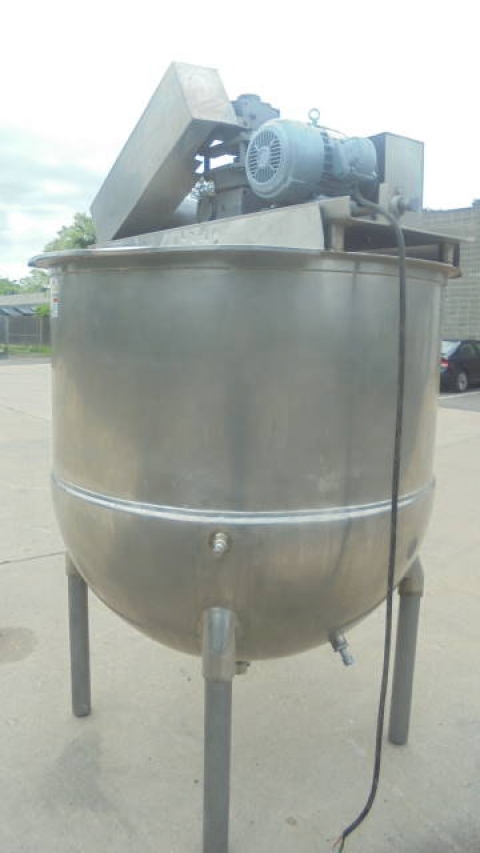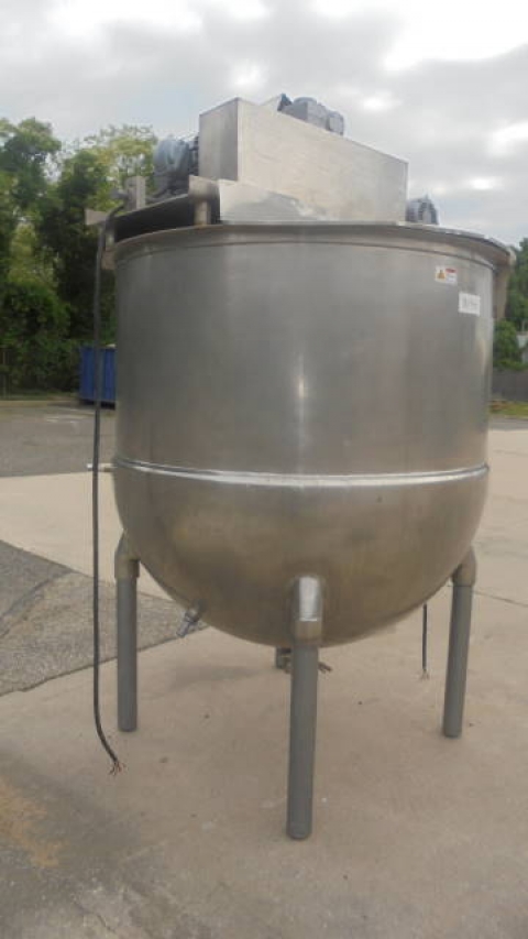 1-Used Groen 600 Gallon Stainless Steel Hemispherical Double Motion Jacketed Kettle Model N600SP, S/N 5671. Dimensions approximately 60 inch diameter by 58 inch deep, kettle jacketed for 45 PSI @ 650 Degrees F, National Board & Code Stamped. On legs, kettle has approximately 2 inch diameter center bottom outlet. Tank has lid and two top-mounted drives (5HP, 3/6/208-230/460 volt motor for the counter rotating agitator and 3HP, 3/60/230-460 volt motor for the scraper agitator). (Stock # 8174E)