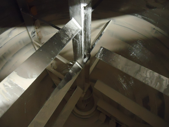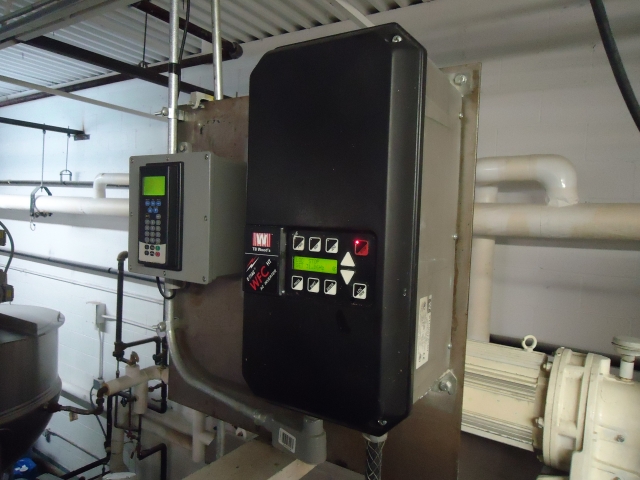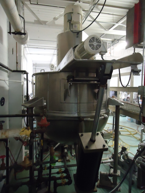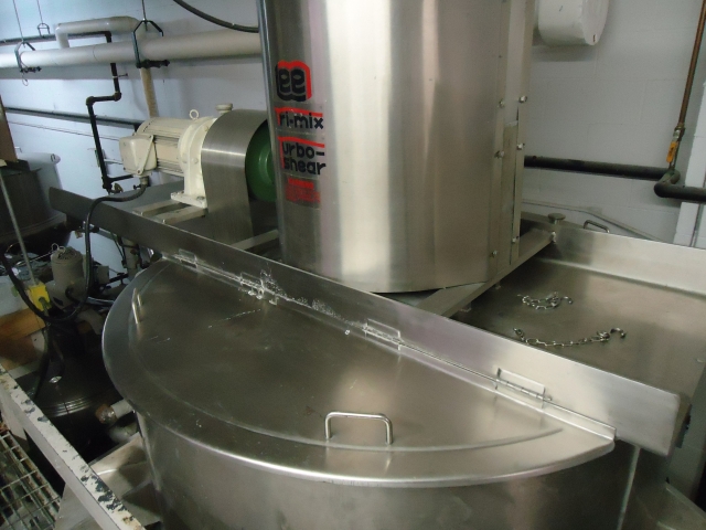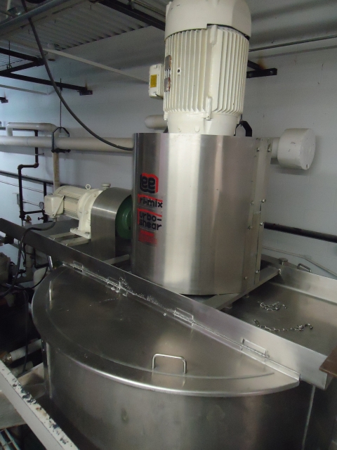 1-Used Lee 600 Gallon Stainless Steel “Tri-Mix” Jacketed Triple Motion Mix Kettle Model 600D12T, S/N B7488A1.  Kettle equipped with double motion scraper type agitation driven by 15 HP 3/60/230-460 volt motor.  With water actuated tilt cylinder for “tilt out” of agitation assembly.  Also equipped with High Speed Homogenizing Head driven by 40 HP/20 HP 3/60/460 volt motor.  Equipped with variable frequency drive for variable speed operation.  Kettle is jacketed for 90 PSI @ 332 Degrees F, National Board # 5476, Code Stamped.  On stainless steel legs, Kettle has center bottom outlet with valve.  (Stock #L1259)