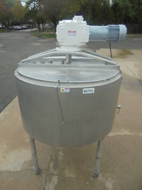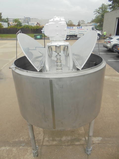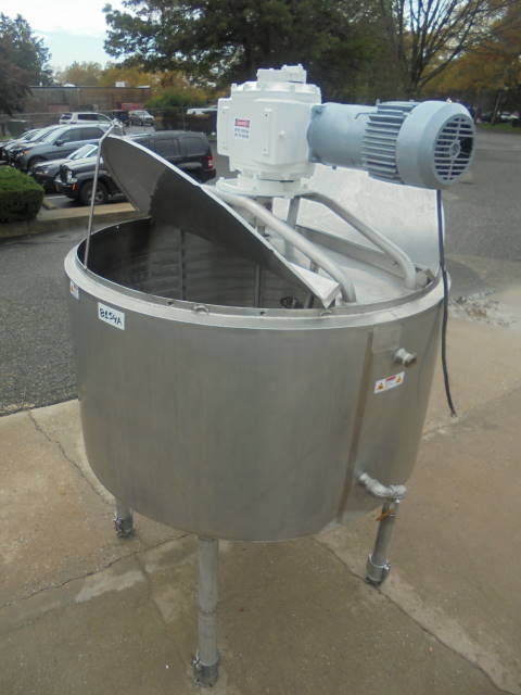 1-Used Mueller Approx. 600 Gallon Stainless Steel Jacketed Cone Bottom Scrape Surface Agitated Kettle, S/N 118949-2. Interior dimensions approx. 66 In. diameter x 38 In. on the straight side, plus approx. 17 In. deep cone bottom. Jacketed rated 90 PSI at 400 Deg. F, National Board Number 1892, code stamped. Equipped with scrape surface agitation for sides and bottom head, agitator driven by 7.5HP, 3/60/230-460 Volt motor. On approx. 42 In. high stainless legs, vessel has center bottom discharge outlet. Equipped with interior stainless steel baffle vessel has hinged lids. (Stock #8154A)