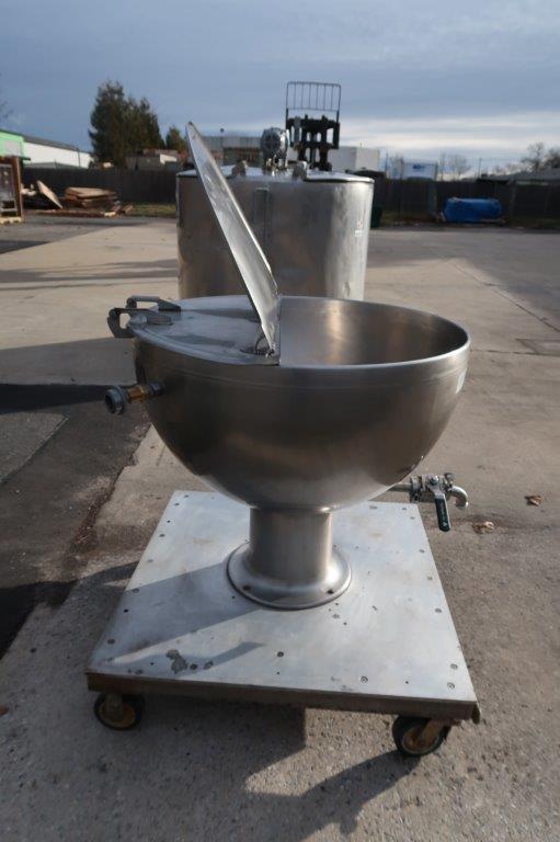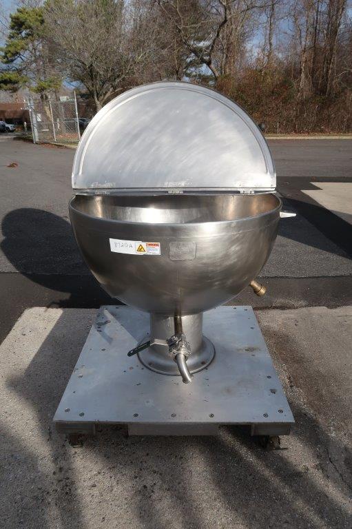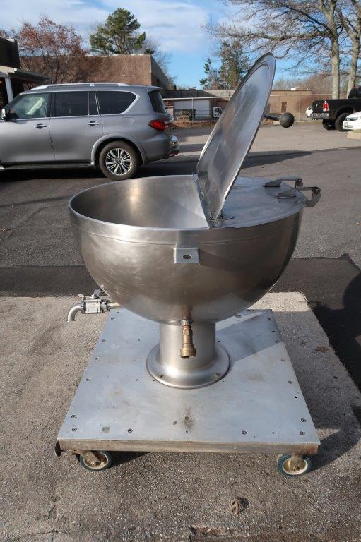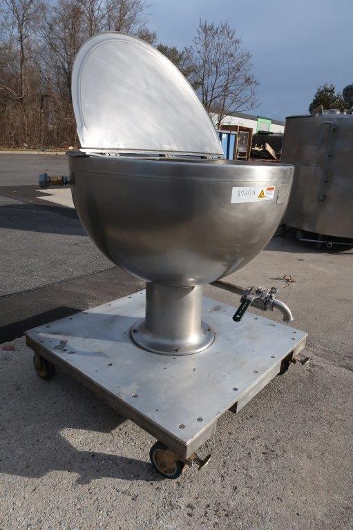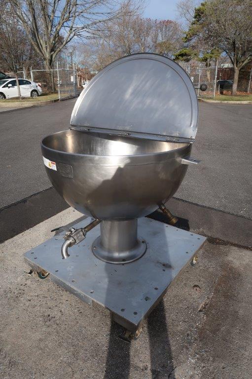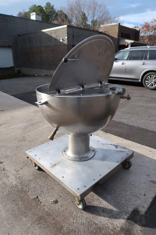 1 – Used Groen 80 Gallon Stainless Steel Jacketed “Shallow Design” Kettle, Model GPT-80, S/N 6289. This pedestal style kettle has dimensions of approx. 40 In. diameter by 23 In. deep. Unit is jacketed for 25 PSI @ 300 degrees F., National Board and Code stamped. Mounted on portable base with casters, kettle has stainless steel hinged lid and bottom discharge outlet with valve and 1-1/2 inch diameter Tri-Clamp fitting. (Stock # 8720A)