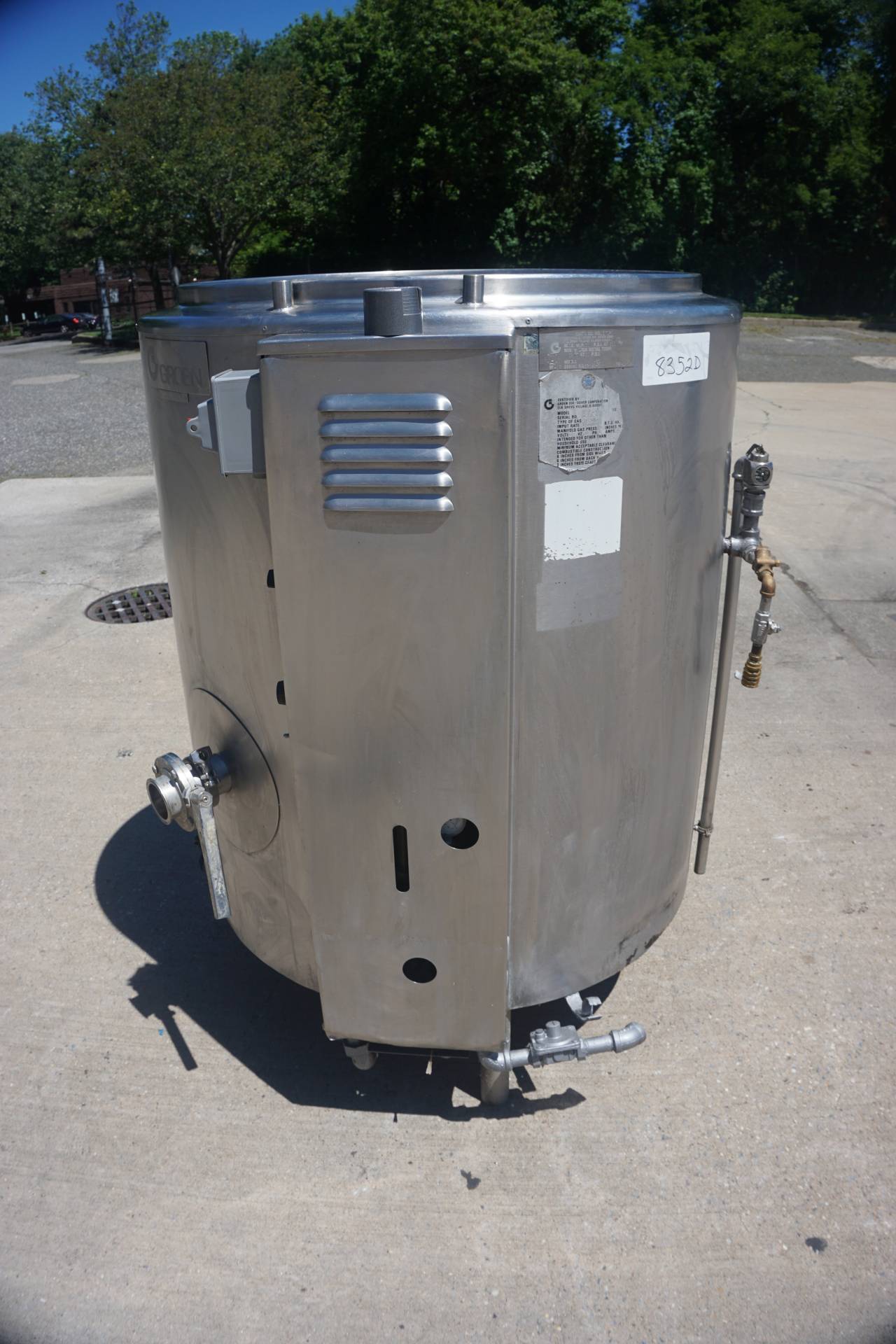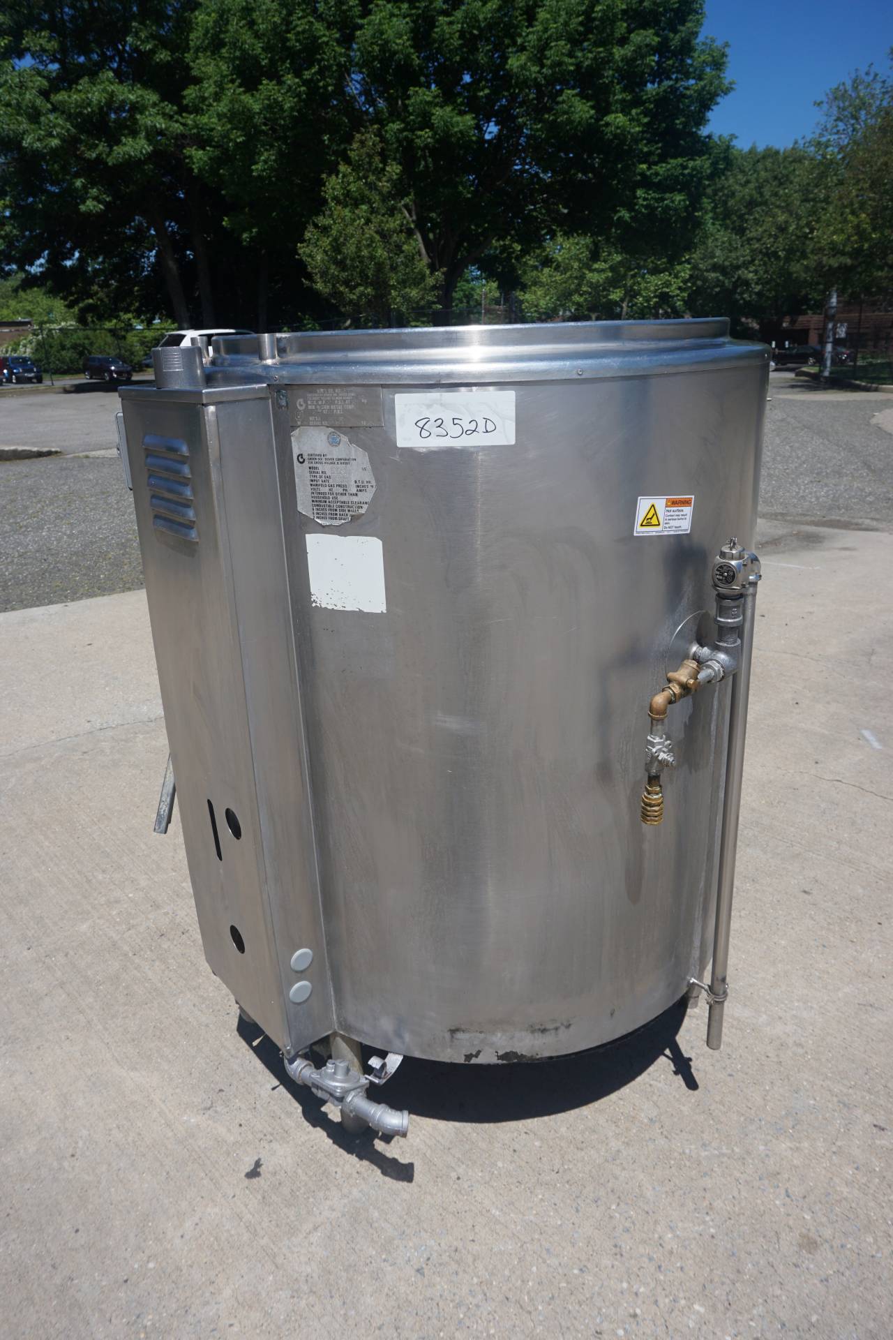 1- Used Groen 80 Gallon Stainless Steel Self-Contained Gas Fired Jacketed Kettle, Model AH/1-80, Serial Number 52120-1. Interior dimensions approximately 32 In. diameter X 30 In. deep. Kettle is jacketed for 30 PSI @ 300 Deg. F, National Board Number 137021, Code Stamped. With 3 In. diameter Tri Clamp discharge. (Stock #8352D)
