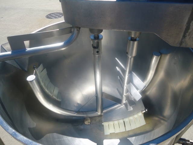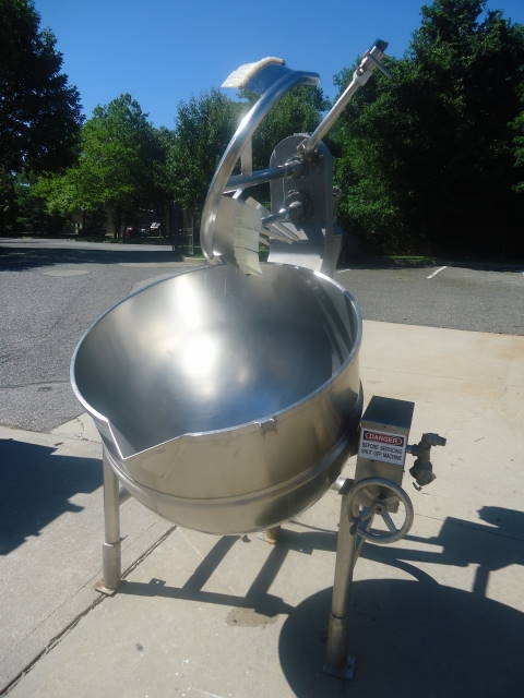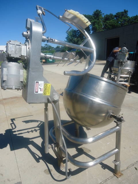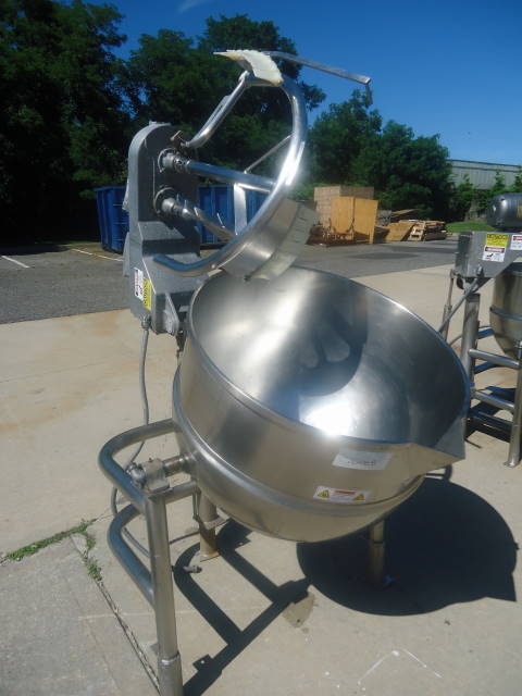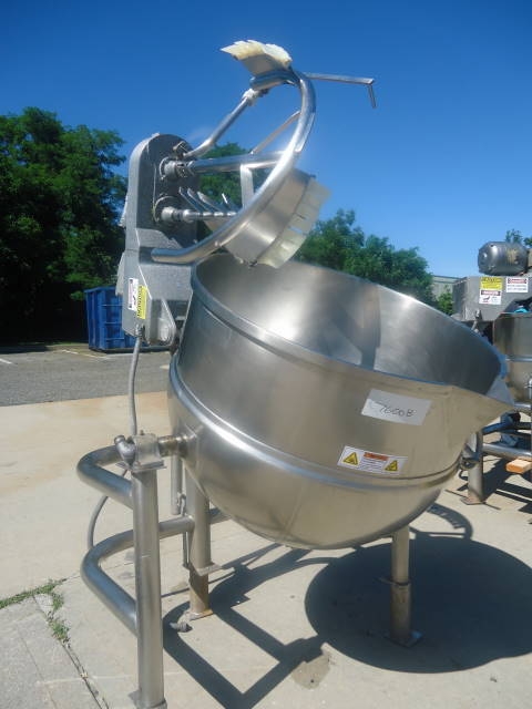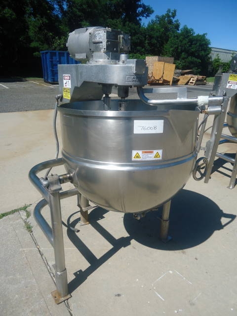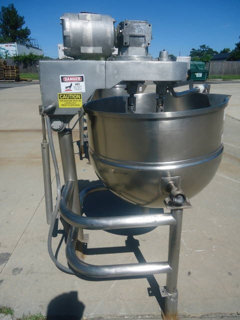 1-Used groen 80 gallon stainless steel jacketed twin action mix kettle model dta/3-80 sp. Kettle is jacketed for 45 psi @ 300 degrees f, national board # 91485, code stamped. Kettle dimensions approx. 34 in. Diameter x 29 in. Deep. Twin action agitation and tilt out of kettle and consists of side scraper agitator, as well as off center counter current bar type agitator. Agitator driven by 2 hp/1 hp 3/60/230 volt motor. Kettle has both tilt type discharge, as well as approx. 2 in. Diameter bottom discharge. On stainless steel legs. (stock #7600b)