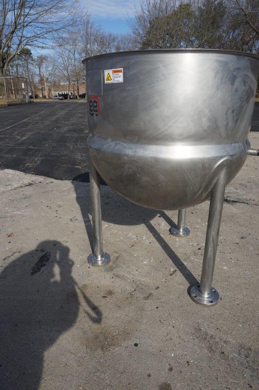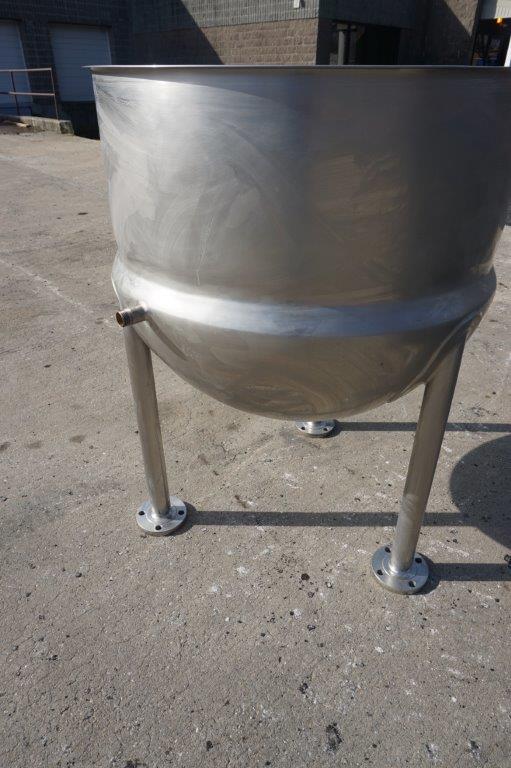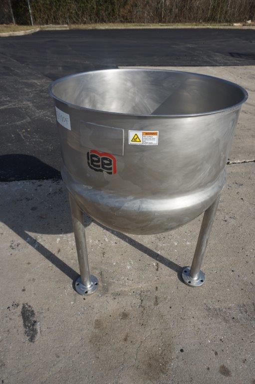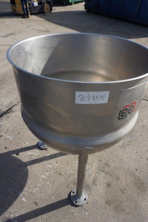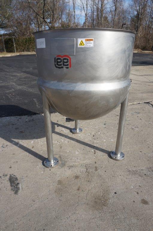 1-Used Lee 80 Gallon Type 316 Stainless Steel Jacketed Hemispherical Kettle, S/N 25686-1-1. Dimensions approx. 34 In. diameter X 32 In. deep, kettle is jacketed for 45 PSI at 292 Deg. F, National Board #9151, code stamped. Equipped with approx. 1 ½ inch diameter center bottom outlet, kettle is mounted on 24 In. high stainless legs and was last used in the food industry. (Stock #8480F)