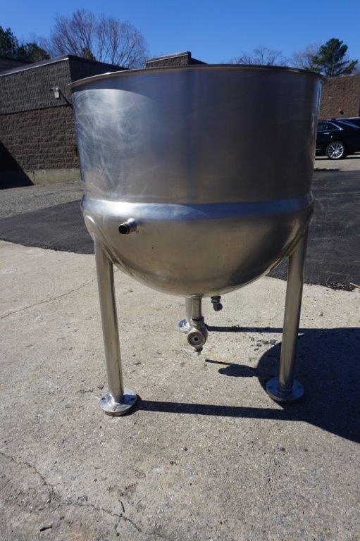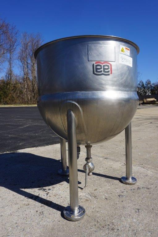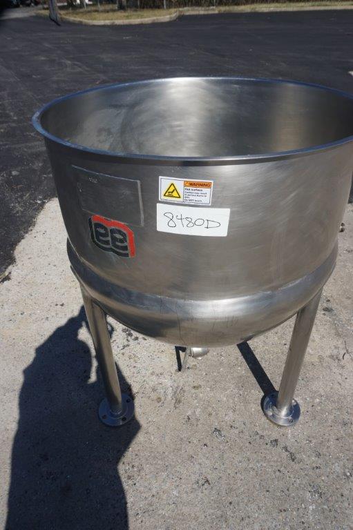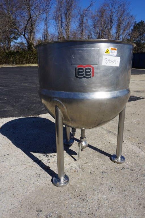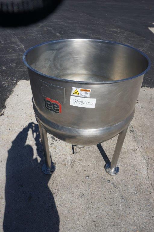 1-Used Lee 80 Gallon Type 316 Stainless Steel Jacketed Hemispherical Kettle, S/N 25686-1-2. Dimensions approx. 34 In. diameter X 32 In. deep, kettle is jacketed for 45 PSI at 292 Deg. F., National Board #9152, Code Stamped. Equipped with approx. 1 ½ inch diameter center bottom outlet, kettle has hand operated discharge valve and is mounted on 24 In. high stainless steel legs. Last used in the food industry. (Stock #8480D)