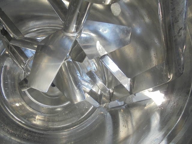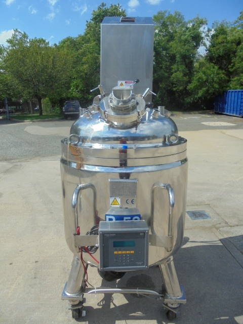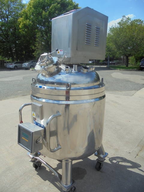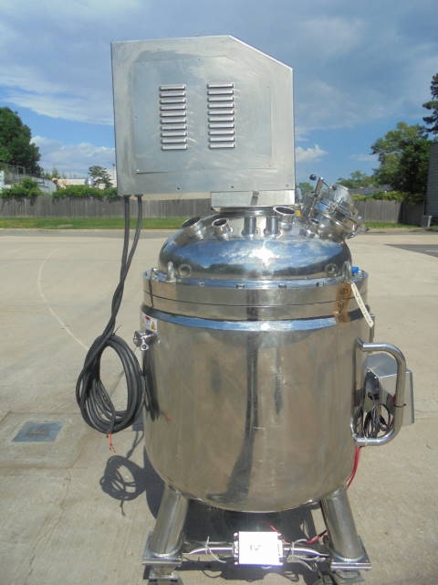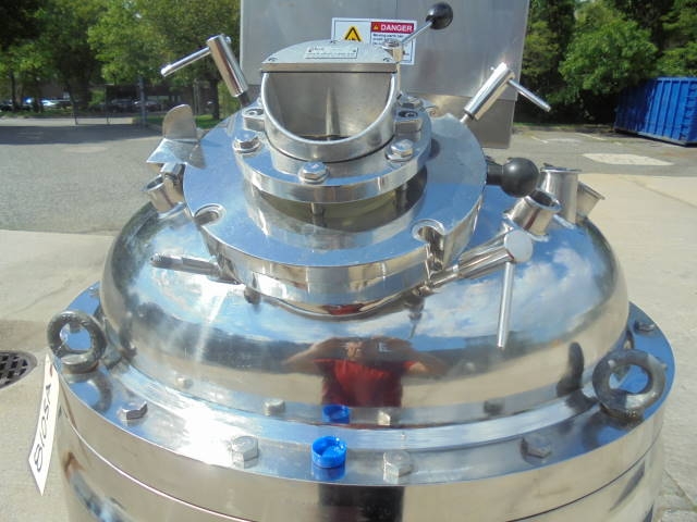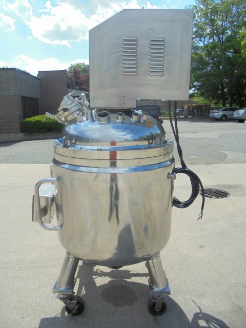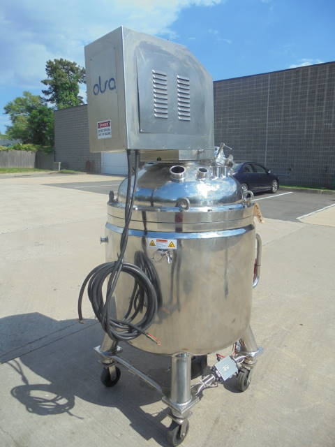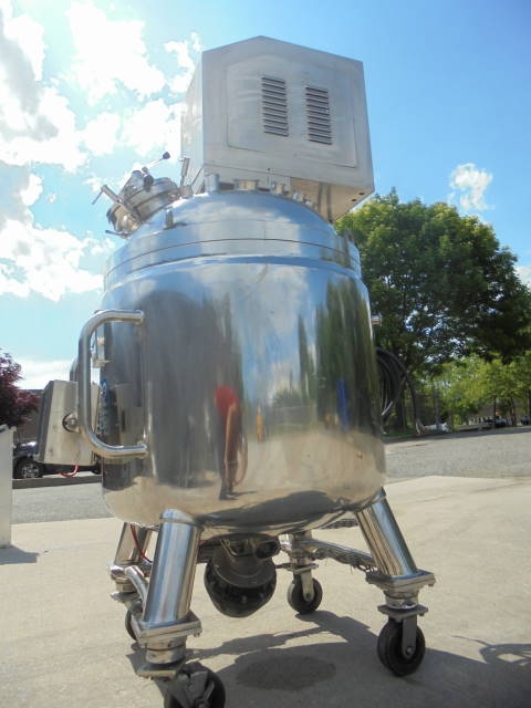 1-Used Olsa approx. 80 Gallon (300 liter) Type 316L Stainless Steel Jacketed Vacuum Double Motion Kettle/Reactor, S/N 4300.  Interior diameter approx. 32 in., Vessel has approx. 11 in. high dome top and dished bottom head.  Rated 116 PSI @ 350 degrees F in jacket and internal rating of 58 PSI/full vacuum @ 305.6 degrees F, National Board and Code Stamped.  With double motion scraper agitator, top driven by Eurodrive “piggy-back” drive motors, scraper agitator currently operates at 42 RPM, counter rotating agitator operates at 90 RPM.  Top head has approx. 8 in. manway with cover and sight glass and has twelve (12) assorted tri-clamp openings. With polished interior surfaces,  vessel has center bottom discharge with pneumatic air valve.  Mounted on portable stand with casters, unit also has Weigh-tronics WI-130 Digital Scale with load cells.  (Stock # 8103A)