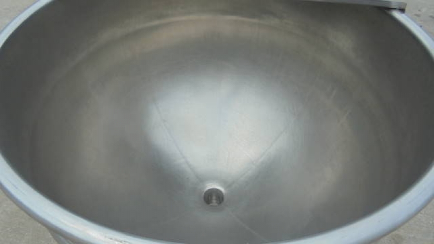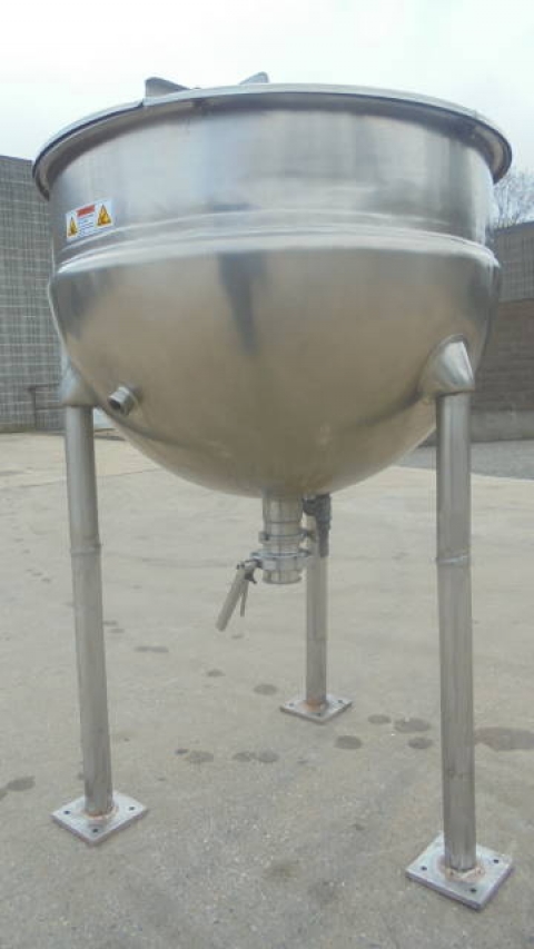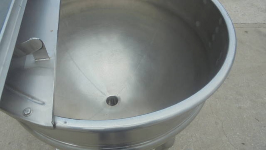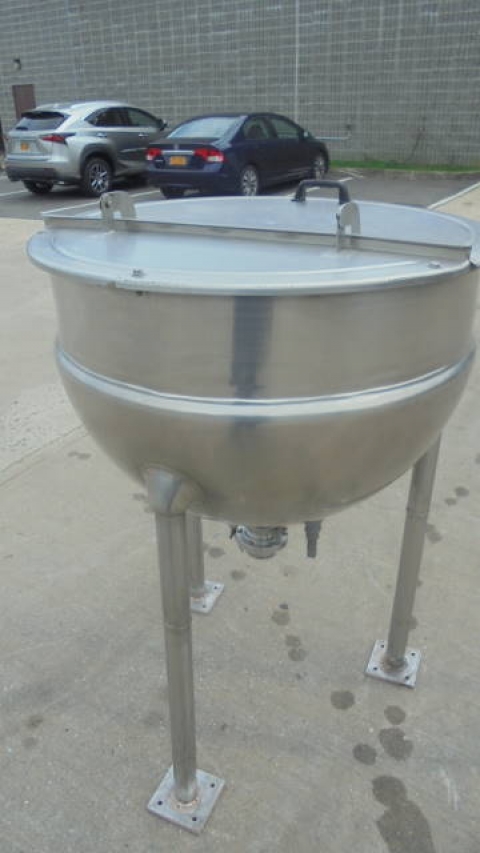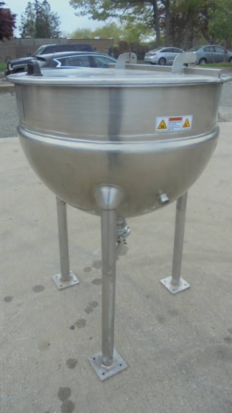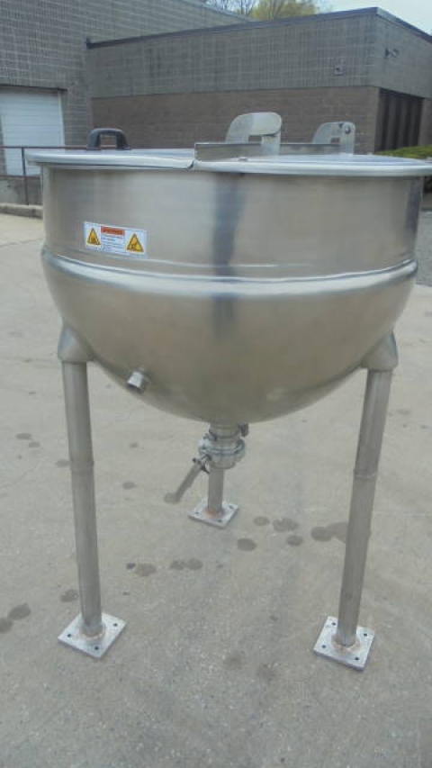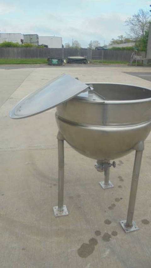 1-Used Trinity Industries/Brighton “Hamilton” 80 Gallon Stainless Steel Jacketed Hemispherical Kettle, S/N D-8581. Kettle dimensions approx. 36 in. diameter x 25 in. deep. Jacket rated 40PSI @ 267Deg. F., National Board # 6591, Code Stamped. Equipped with 3 in. diameter center bottom outlet with valve and tri-clamp fitting. Kettle is on 36 inch high stainless legs and is equipped with stainless steel hinged Lid. (Stock #8074A)