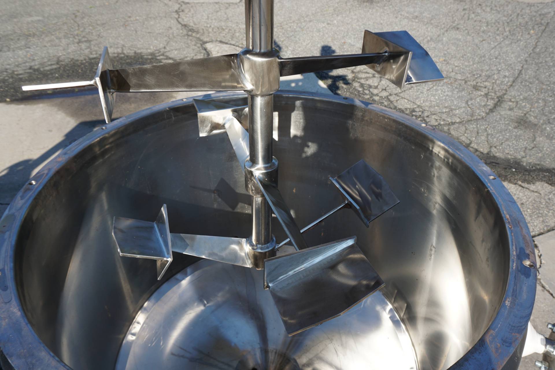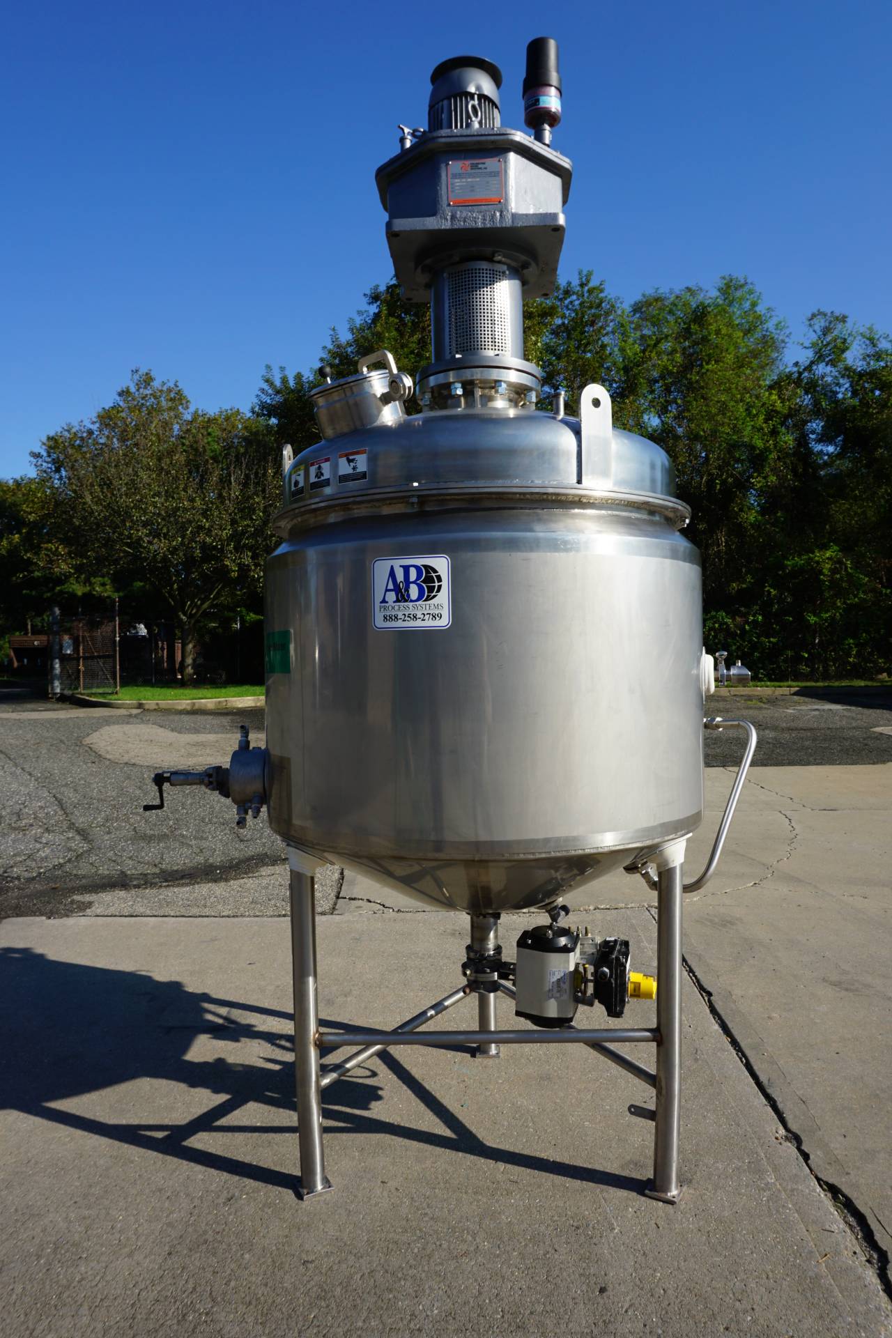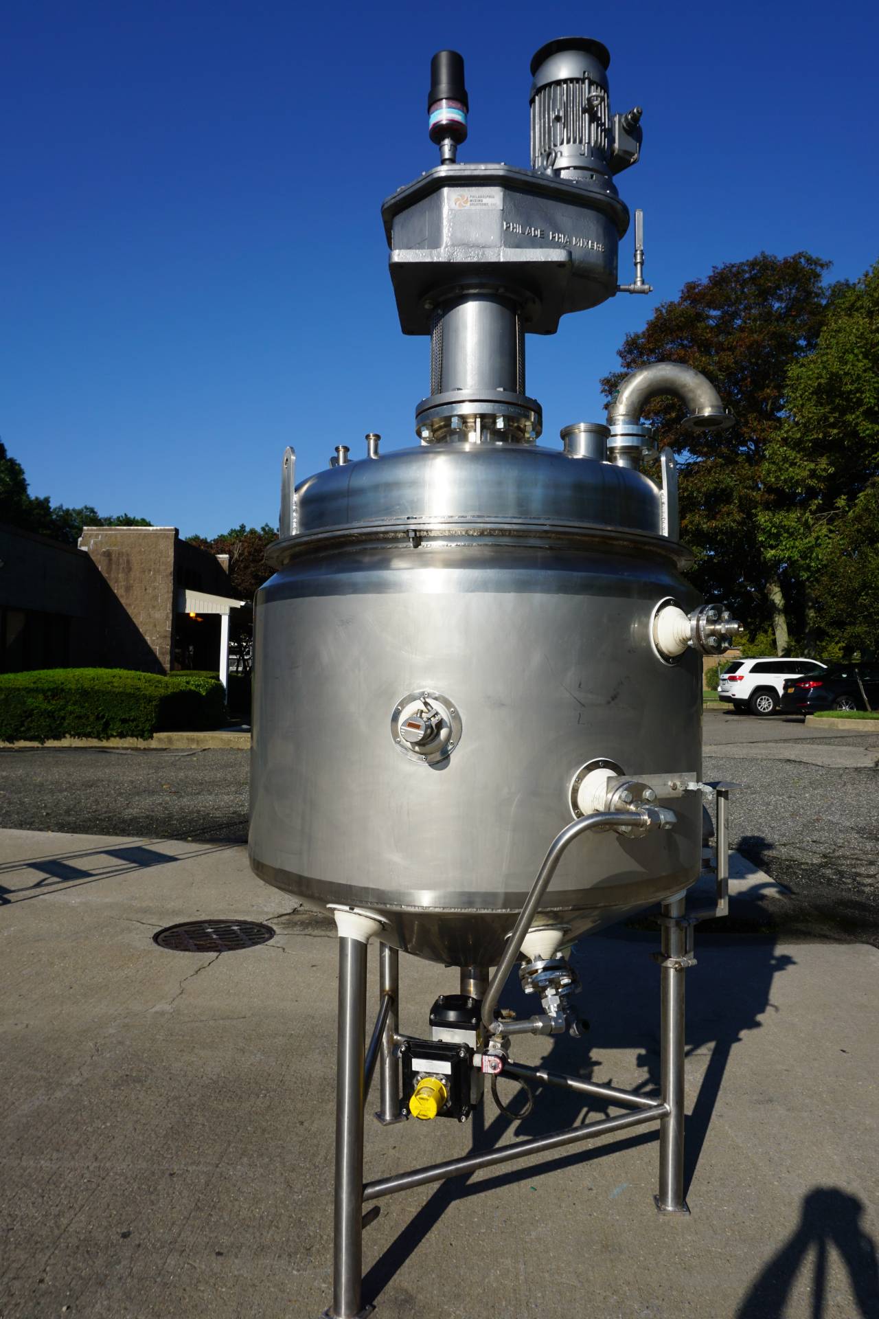 1-Used A & B Process Systems approx. 160 Gallon working capacity Stainless Steel Jacketed Pressurized Agitated Kettle/Reactor, S/N 1502460301. With cone bottom, Vessel has dome top with 8 inch diameter off set manway with lid, as well as two approximately 4 inch diameter top inlets. With bottom center discharge with approximately 4 inch diameter Tri Clamp fitting, kettle rated 150 PSI, National Board 11053, Code Stamped. Equipped with heavy duty cross bar agitation with paddles, agitator driven by Philadelphia 5HP 3/60/230-460Volt motor/reducer. On stainless steel legs, last used for mixing chocolate in food process operation. (Stock #8410A)