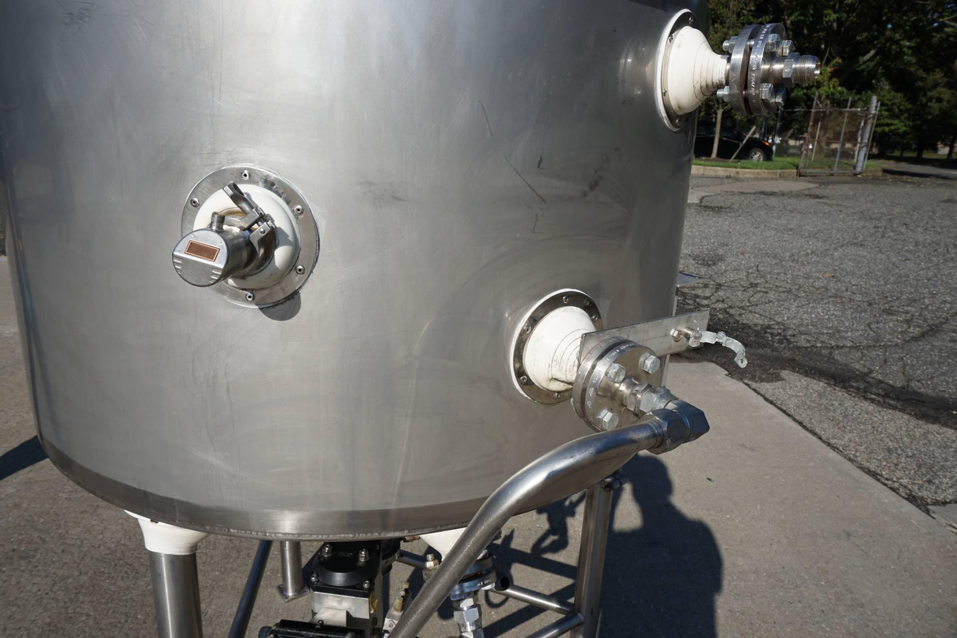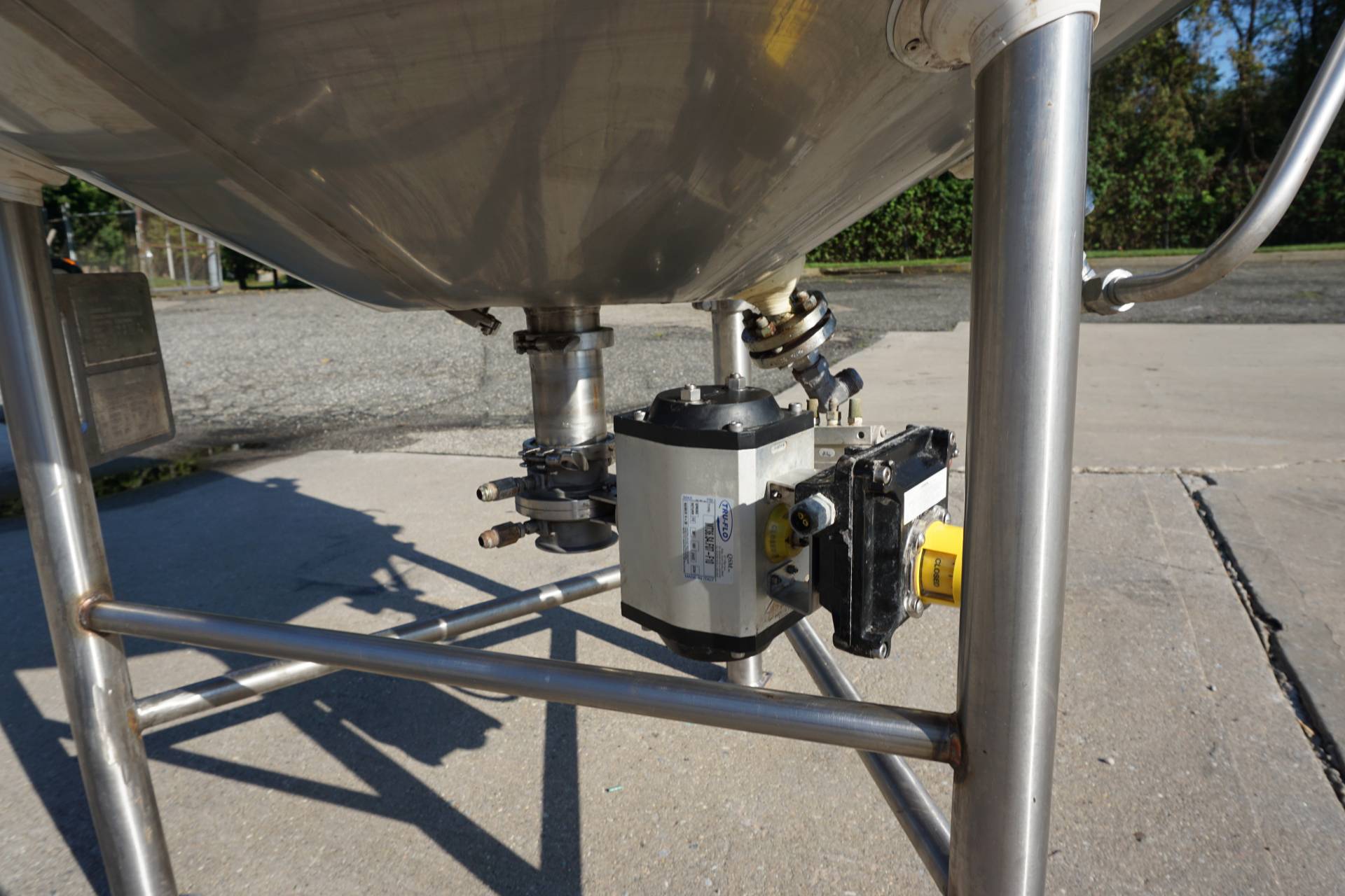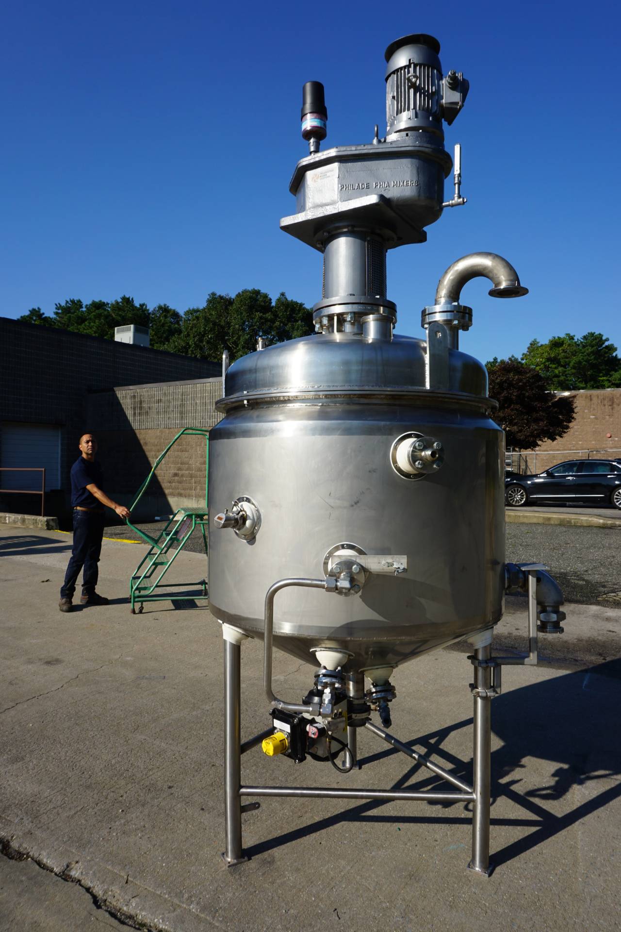 1-Used A & B Process Systems approx. 160 Gallon working capacity Stainless Steel Jacketed Pressurized Agitated Kettle/Reactor, S/N 1502460301. With cone bottom, Vessel has dome top with 8 inch diameter off set manway with lid, as well as two approximately 4 inch diameter top inlets. With bottom center discharge with approximately 4 inch diameter Tri Clamp fitting, kettle rated 150 PSI, National Board 11053, Code Stamped. Equipped with heavy duty cross bar agitation with paddles, agitator driven by Philadelphia 5HP 3/60/230-460Volt motor/reducer. On stainless steel legs, last used for mixing chocolate in food process operation. (Stock #8410A)