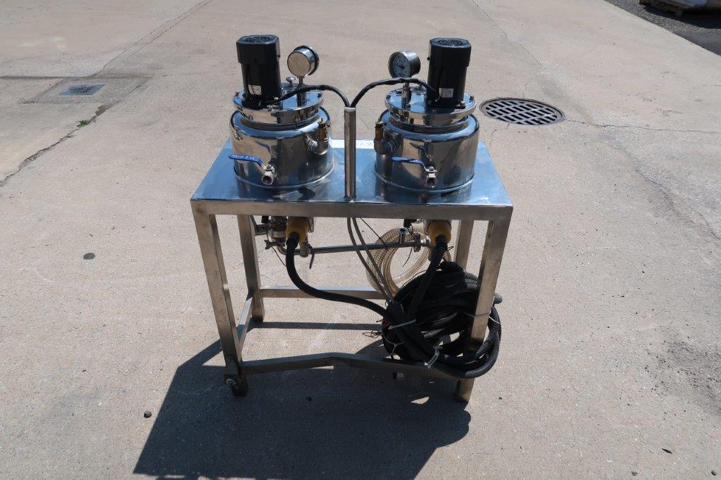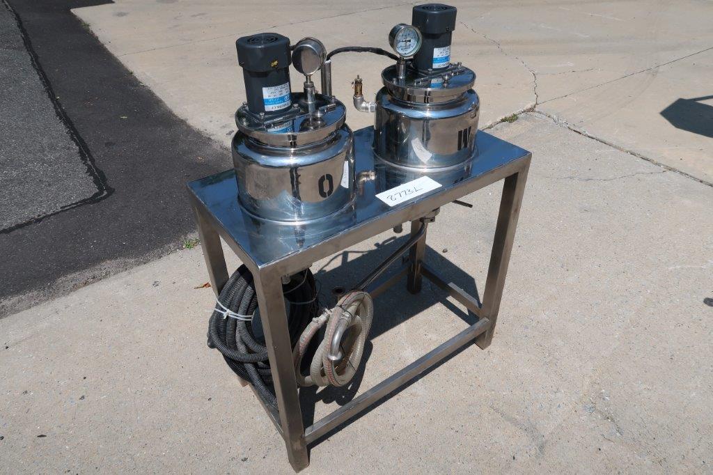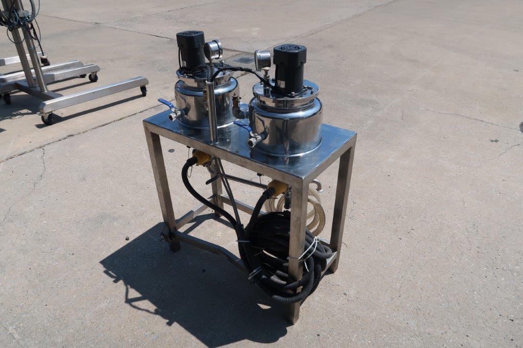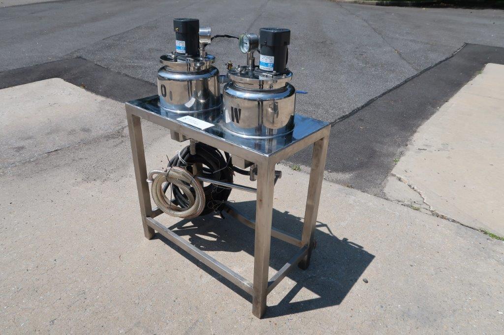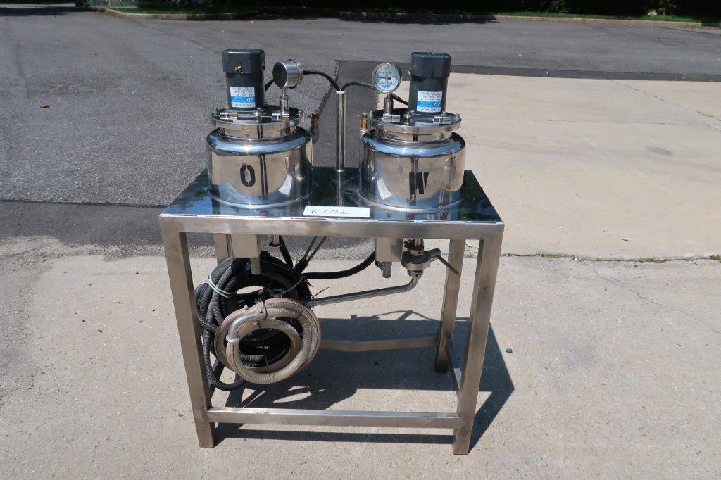 1-Used Battery of Two (2) Approximately 1 Gallon Stainless Steel Jacketed Mix Kettles/Tanks. Each tank measures approximately 7 In. diameter X 8 In. deep. Each tank has fractional HP motor for the propeller agitation, both vessels have center bottom discharge. Mounted on common stainless steel base. (Stock# 8773L)