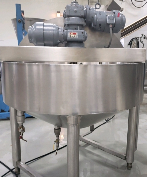 1-Pre-Owned Chester Jensen 100 Gallon Stainless Steel Jacketed Cone Bottom Cooker/Cooler. Last used in food production, Machine has side scraping agitation, as well as center blade agitation and stainless perforated baffle. (Stock #L1317)
