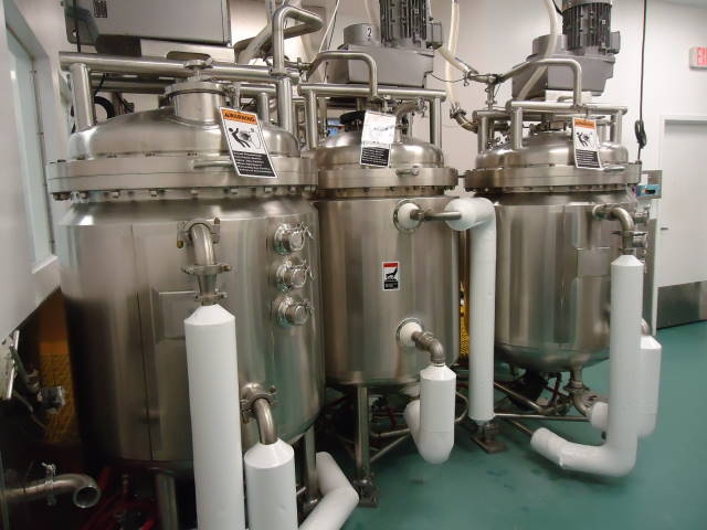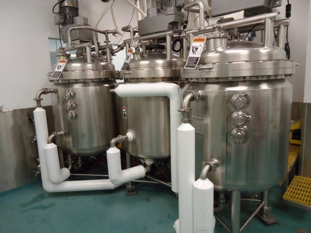 3-Used Feldmeier 400 Liter (approx. 100 gallon) Type 316L Stainless Steel Sanitary Jacketed Vacuum Agitated Reaction Vessels. Vessels are rated 60 PSI internally and 75 PSI in the jacket. With bolted top heads , Vessels have heavy duty side scraper agitator driven by 10 HP top mounted motor. Can be supplied with Control Panel and External Heating System. Vessels have light gauges and numerous desirable features. (L1211)