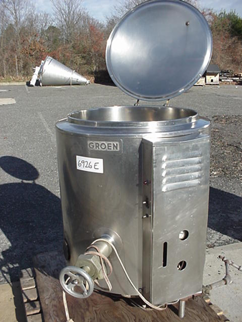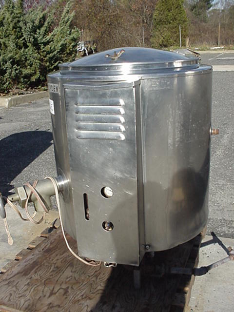 1-Used groen model ah-40-sp 40 gallon stainless steel self-contained gas fired kettle. Jacket rated 30 psi @ 300 degrees f. National board number 27026 and code stamped. Dimensions approx. 26″ diameter x 22″ deep. Kettle has hinged lid and approx. 2-1/2″ diameter tangential outlet with valve.