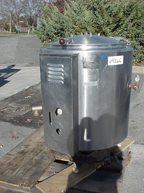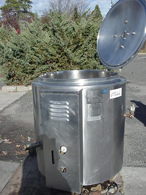 1-Used groen model ah/1-40 gallon type 316 stainless steel self-contained gas fired kettle. Dimensions approx. 26″ diameter x 23″ deep. Kettle rated 30 psi @ 300 degrees f. National board number 92238. Code stamped. With hinged lid, tank has tangential discharge outlet.