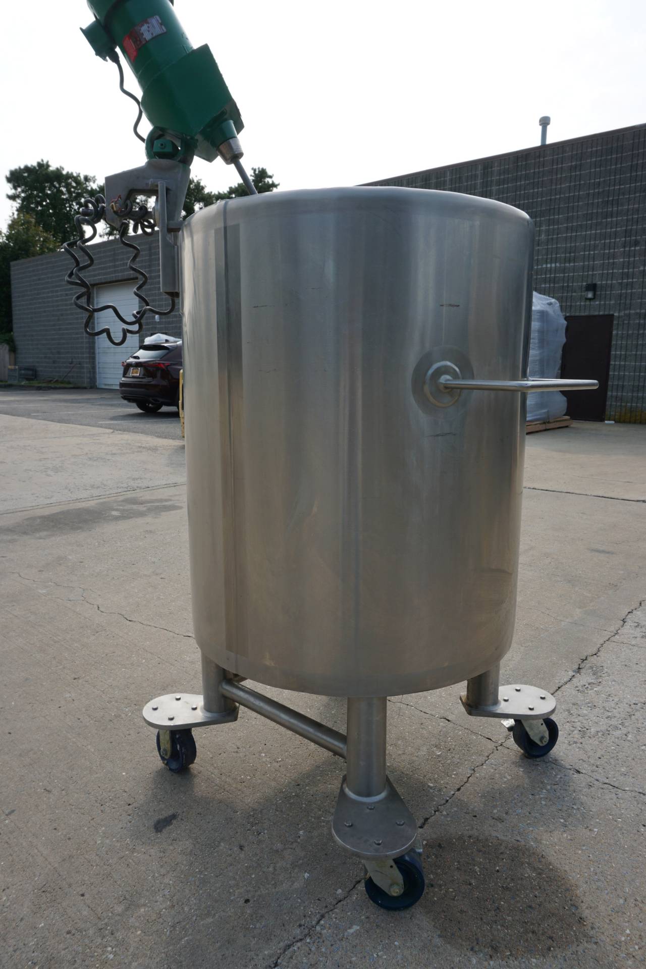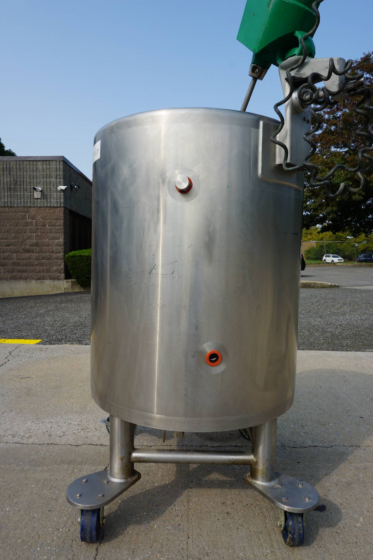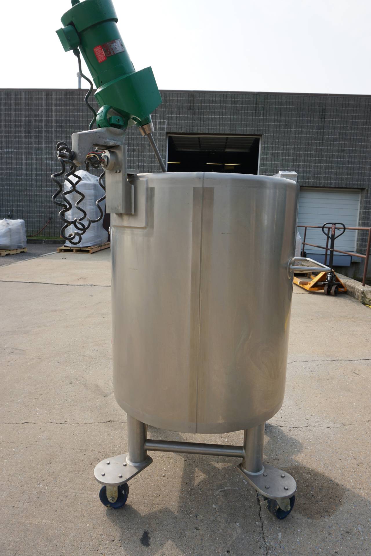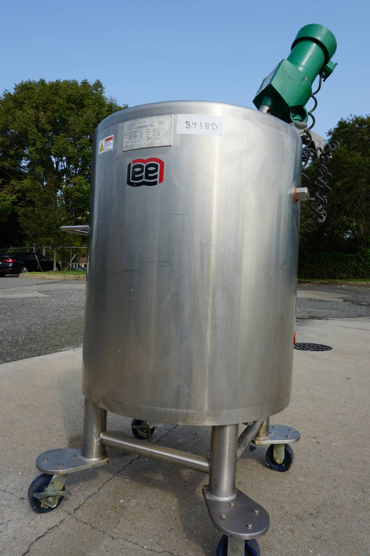 1-Used Lee 100 Gallon Type 316 Stainless Steel Jacketed Mix Tank, S/N 22210-1-1. Interior dimensions 30 In. diameter X 36 In. deep. Jacket rated 100PSI at 338 Deg. F., National Board number 8888, code stamped. Equipped with dished bottom with approx. 2 In. diameter center-bottom outlet with valve, tank is mounted on Stainless steel legs with casters for portability. With “push-bar” for easy transport, Tank has stainless steel agitator mount and clamp-on top entering propeller agitator. Last used in the pharmaceutical industry. (Stock #8418B)