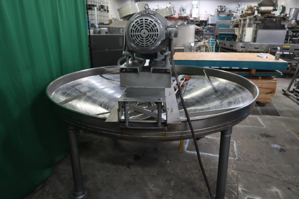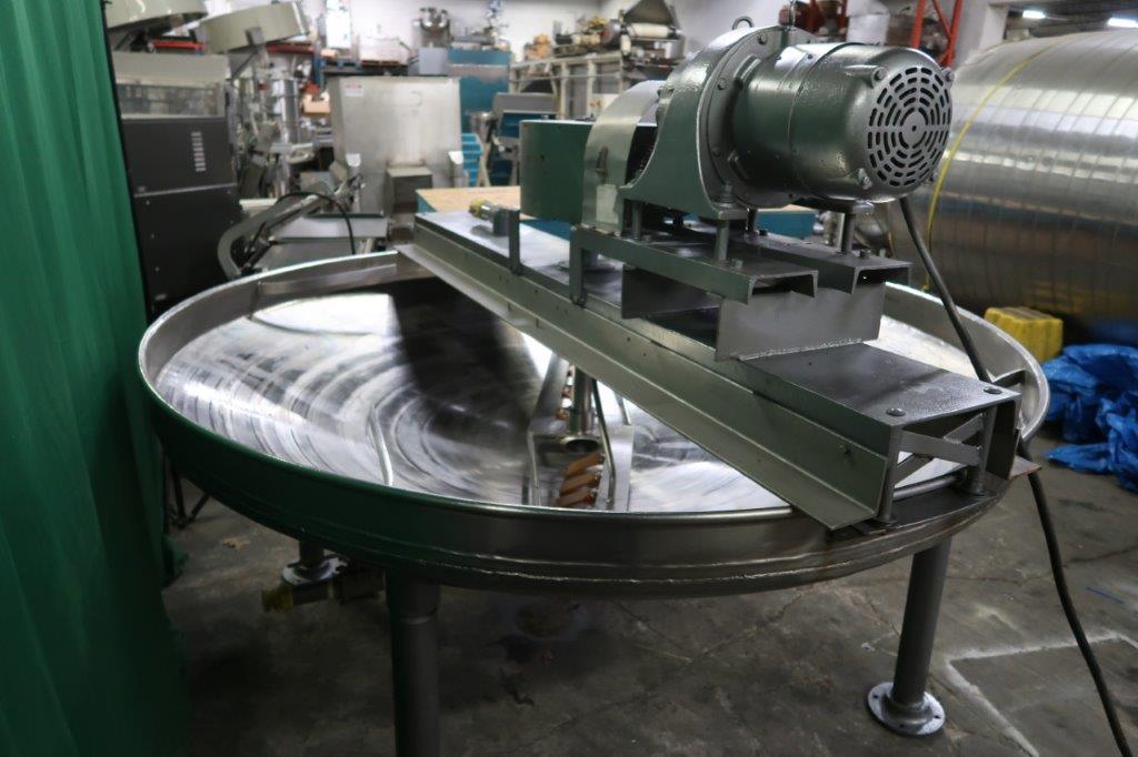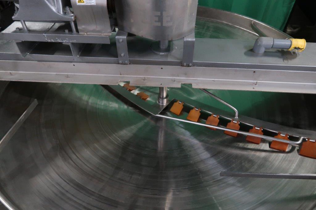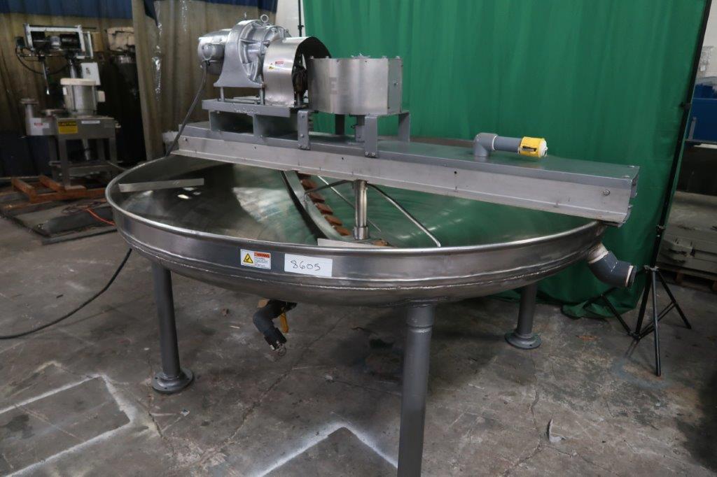 1-Used Lee “Shallow Design” Stainless Steel Jacketed Scraper Agitated Kettle/Pan.  Pan measures 90 In. diameter and is designed for cooking preserves, gravy, stew, pie fillings, etc.  With top motor gear motor driving the slow speed scraped surface agitator, product is gently moving across surface of the kettle to preserve integrity of product being processed. Mounted on 36 In. high legs, kettle/pan is 4 In. diameter bottom center outlet with hand operated valve.  (Stock #8605)