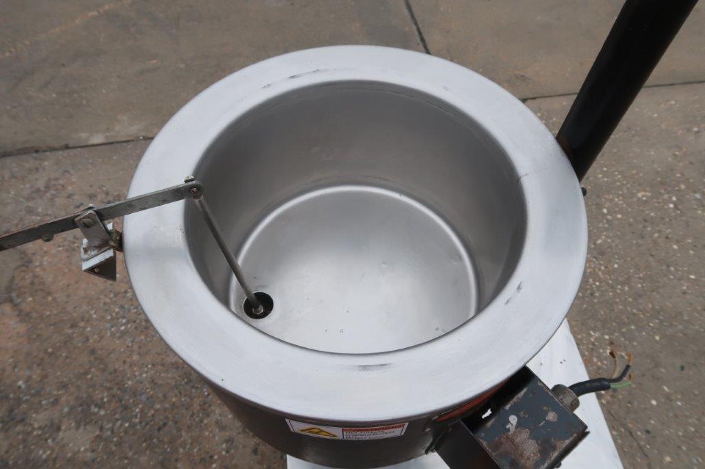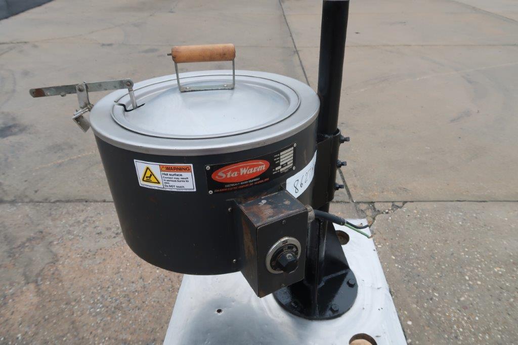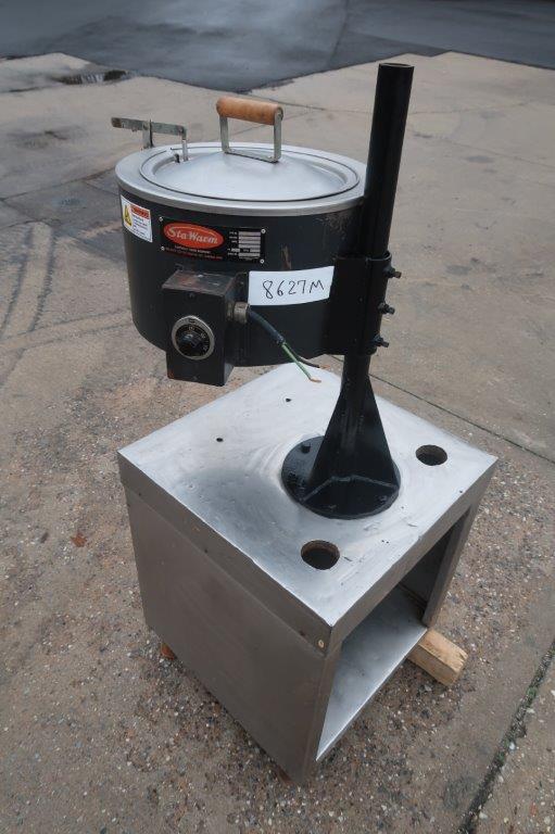 1- Used Sta-Warm 5 Gallon Self-Contained Electric Kettle, type 50CNSS, S/N E0912-B2. Interior dimensions 14 inch diameter by 8 inch deep, this electric kettle has top lid and approximately 1 inch diameter bottom outlet. Electric specifications single phase, 60 cycle, 240 volt, Kettle is mounted on table. Last used in personal products industry ( Stock # 8627M )