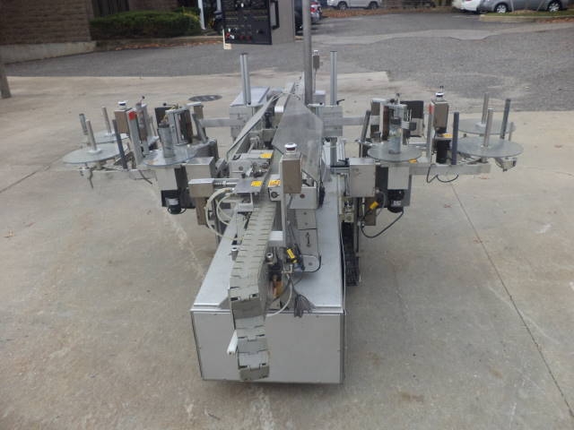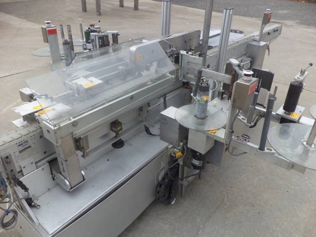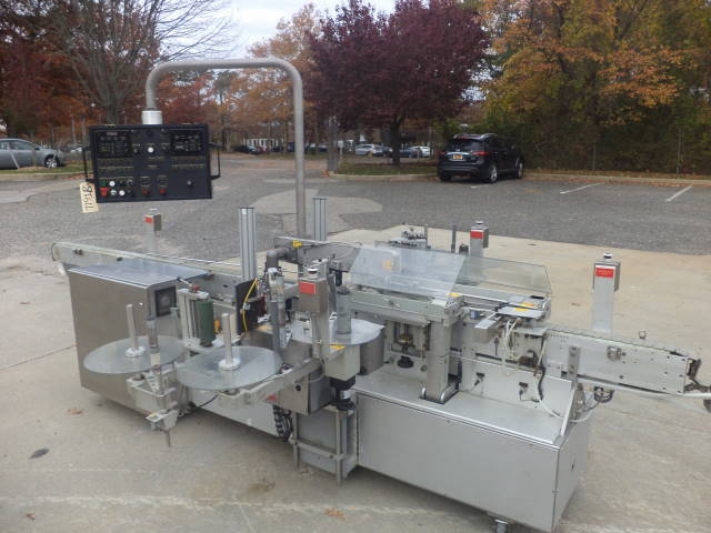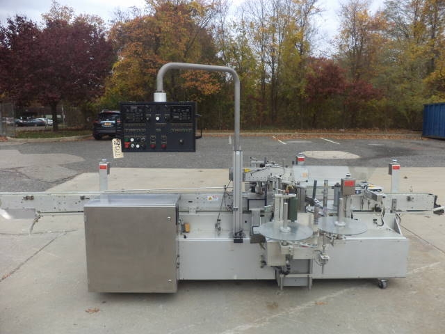 1-Used Accraply Model 350PVF Automatic Front & Back Pressure Sensitive Labeling Machine, S/N 2910. With “hold down” belt for stabilizing of containers, machine has electric specifications of single phase, 60 cycle, 230 volt. Last used in personal care products facility. (Stock #7791BB)